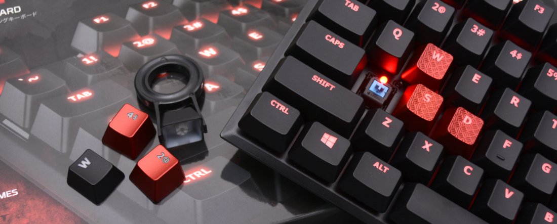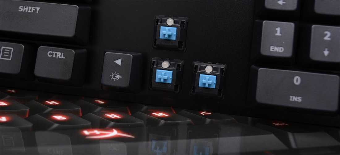 Instead of using a cheaper switch, Kingston has swung for official Cherry MXs with our sample featuring the blue ones. It's my understanding that for now at least this keyboard only comes with the option of the loud blue switches. These switches have an actuation distance of 2.2mm, they feel quite tactile, and produce a loud click.
