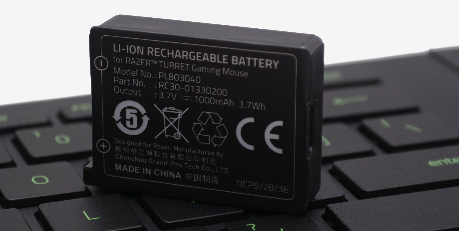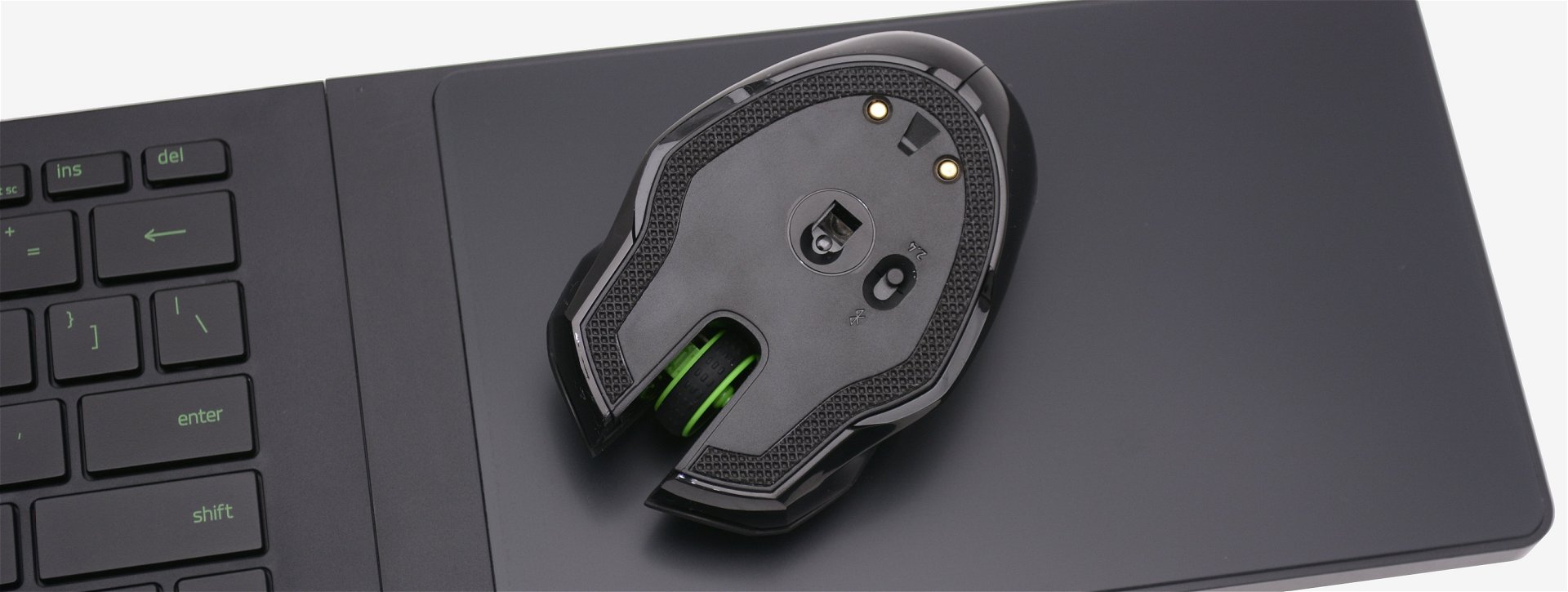Powering the mouse is a smaller but removable Li-Po 1000mAh battery. Razer says the battery is good for 40 hours of non-stop gameplay. The mouse cannot be physically turned off, so when idle it presumably goes into a sleep mode. Like the keyboard, you can quickly toggle the mouse between 2.4GHz wireless and Bluetooth.