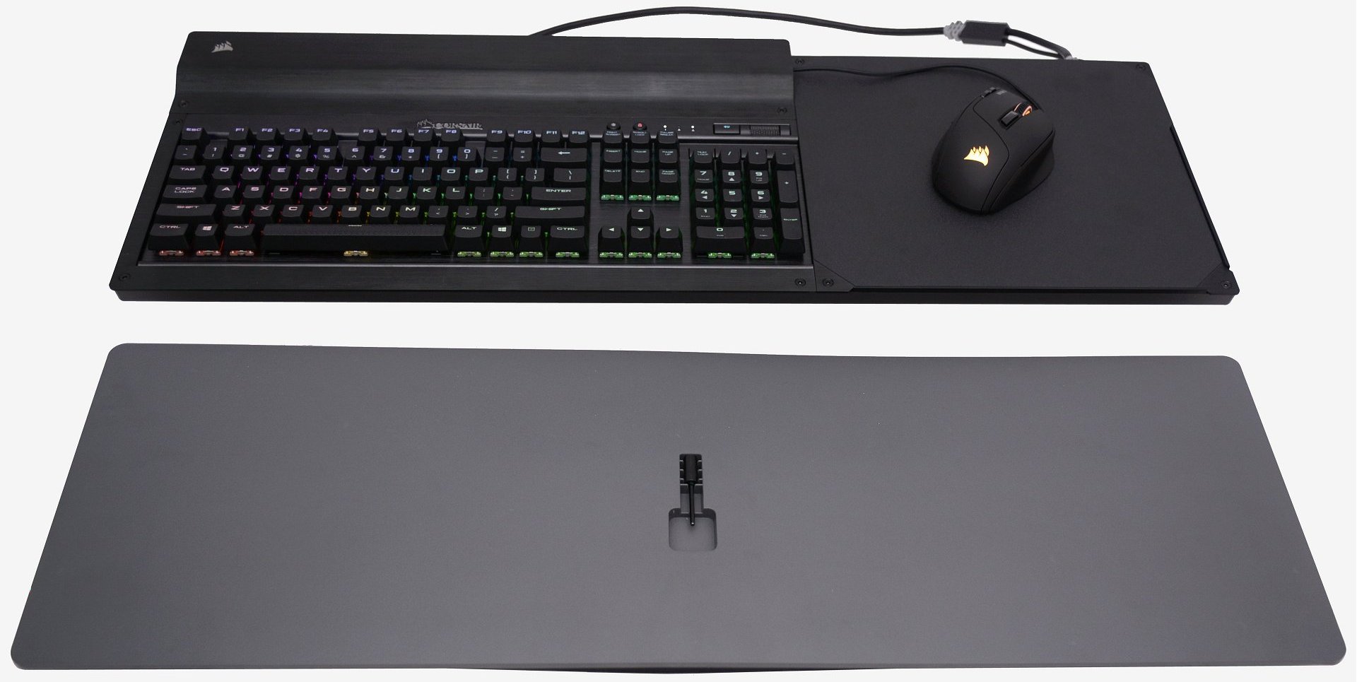 Opposite the mouse pad is the keyboard tray. Designed featuring an adapter plate the tray can cater for Corsair's full size K70 series as well as their tenkeyless K65 series. The keyboards fit like a glove and while that is to be expected I was still for some reason very impressed with the neat fit.