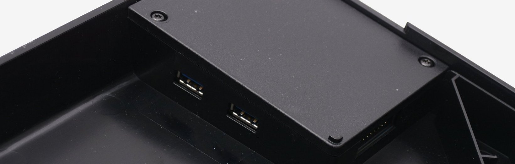 This USB hub is the heart of the Lapdog. Powered by a DC input, this USB 3.0 hub provides users with four powered USB 3.0 ports. Two of these ports are internal, and are designed to connect your keyboard and mouse.