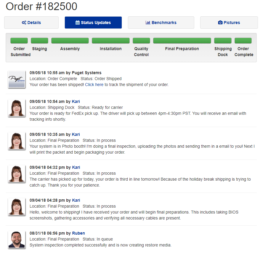 With the final components chosen, Puget started the building process. We've seen many examples of boutique PC builders keeping you posted on the status of your system, but few as detailed as we saw here. For my build, there were 17 pages of notes on everything from who plugged in the RAM, to who verified the rear fan was screwed in, who checked the sound output, who created the shipping label, and so on...