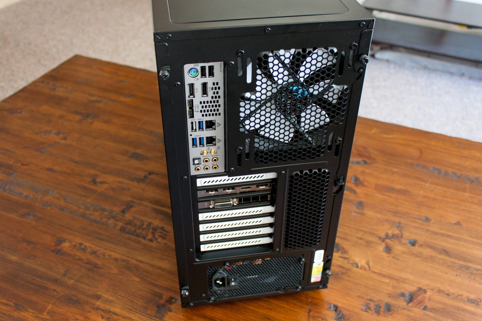 Around back we see the wide variety of I/O from the Gigabyte motherboard. The dual USB-C and dual Ethernet ports are a great feature for content creation where you may need access to multiple networks and high-speed devices. To the right of the power supply, Puget has added stickers containing information on the Windows 10 product license and an internal serial number identifying this PC to Puget.