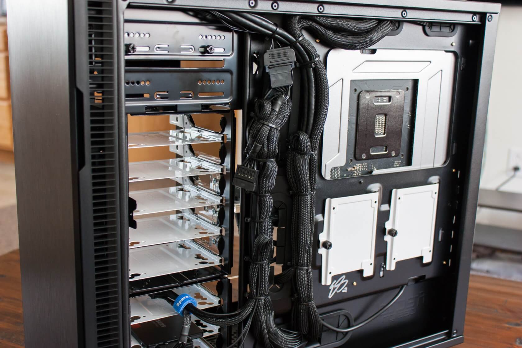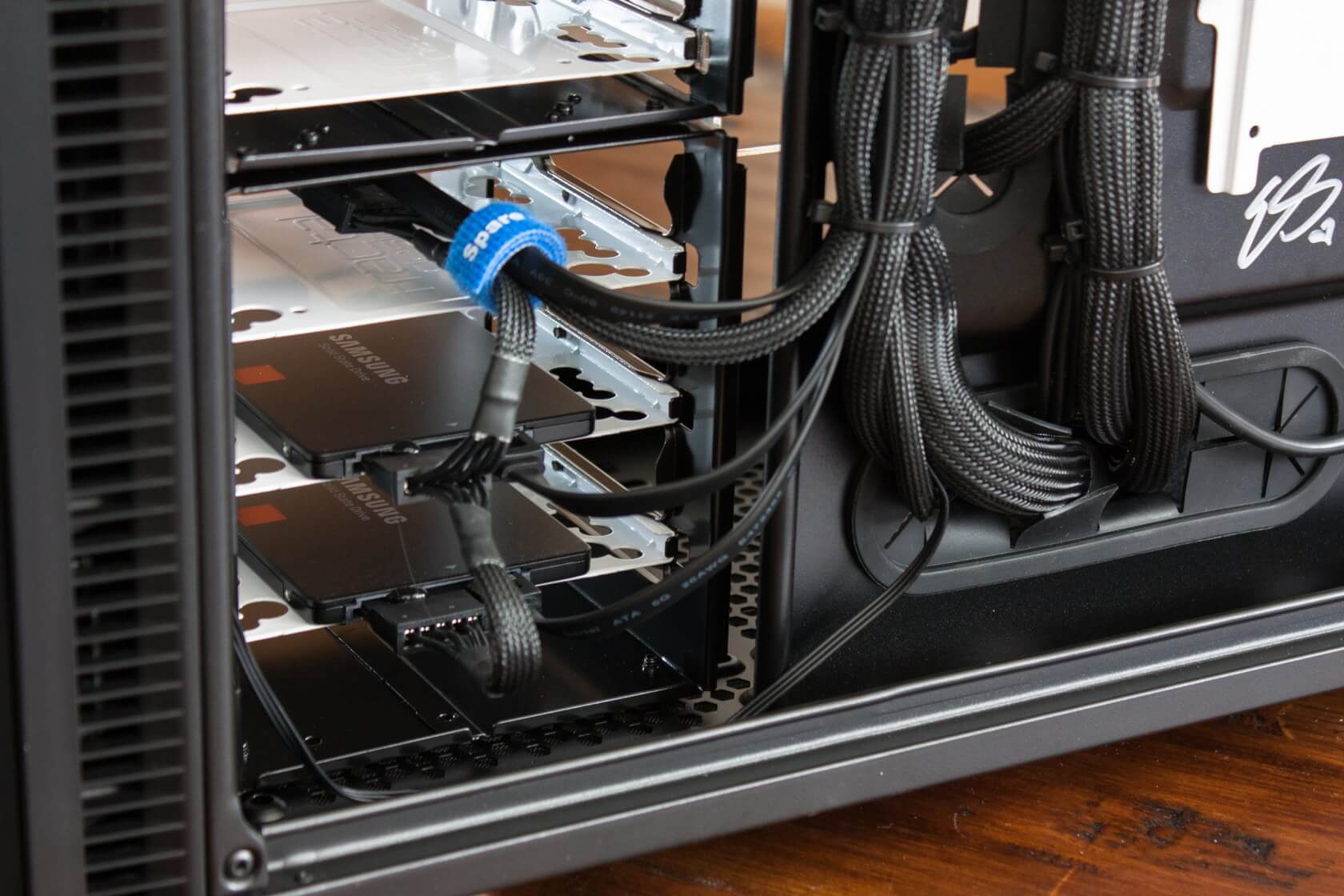 Moving around back, the excellent cable management continues. Everything is neatly managed and zip tied into place. Puget has also included an extra set of SATA data and power cables for future expansion. I thought the custom velcro with a "spare" label was a nice touch. Below the two extra hard drive mounts we find the signature of the Puget employee who built the system.