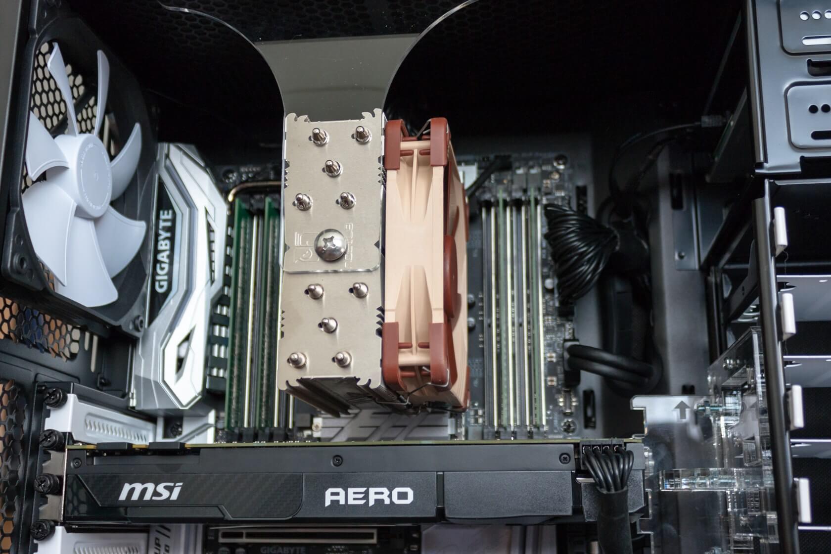 The CPU heatsink piece screws into the top of the case and fits perfectly around the individual heat pipes of the Noctua NH-U12DX i4. The GPU mount screws into the side of the hard drive bays and has support fingers for multiple GPUs. Every component in the build is customizable, but I do have two small issues with the default component choice for this build.