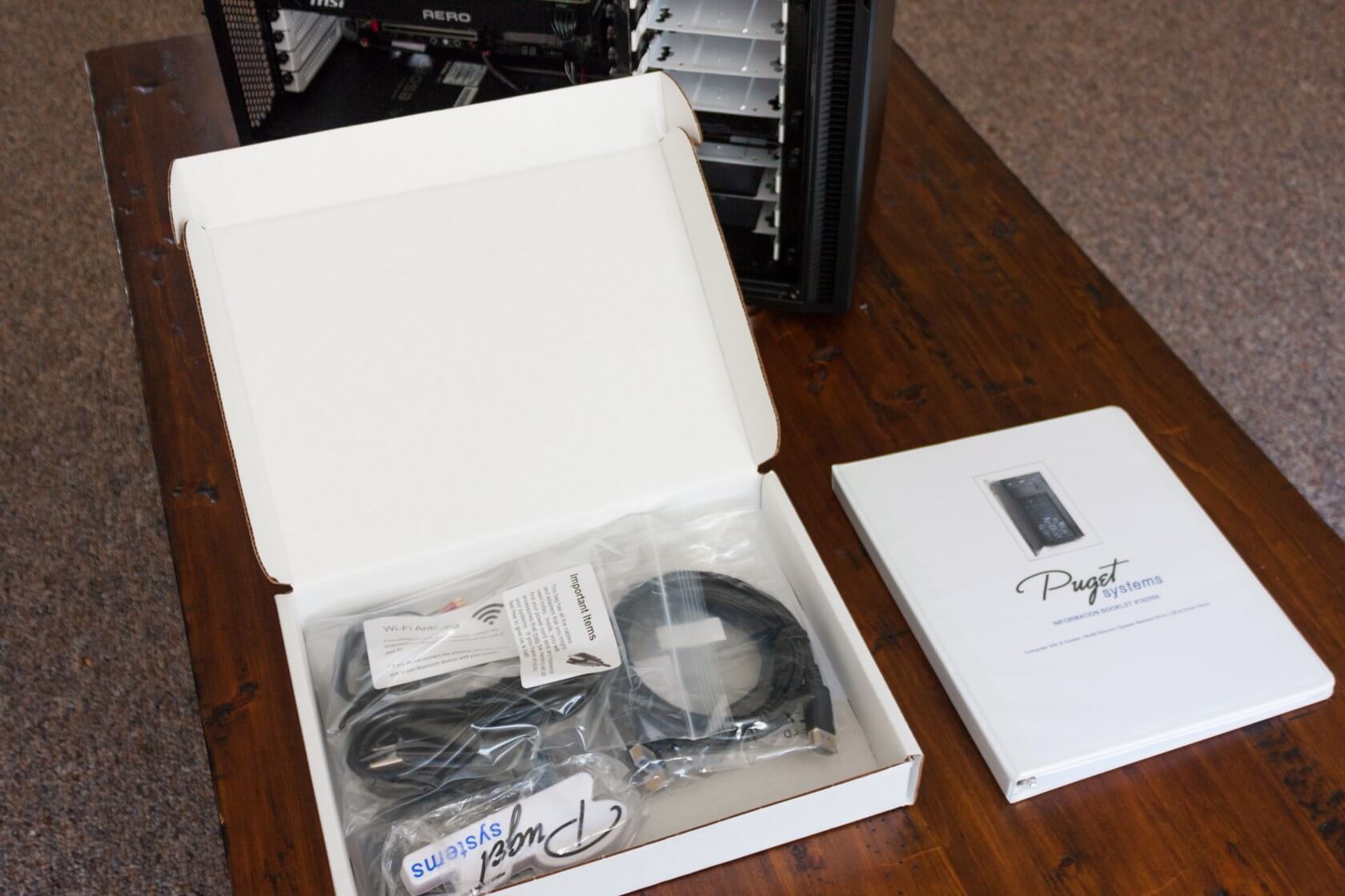 Puget includes a box of extras and a binder of system details. Power cable and video cables, Wi-Fi antennas, and more. The system's binder has a personalized note signed by the company president, detailed photos of the system including thermal imaging, a list of FAQs, several startup guides for common tasks, the full list of assembly details and benchmarks, a recovery USB drive, and optical media for Windows 10 and drivers. This is a great place to go for a paper copy of the system's details and for preliminary troubleshooting.