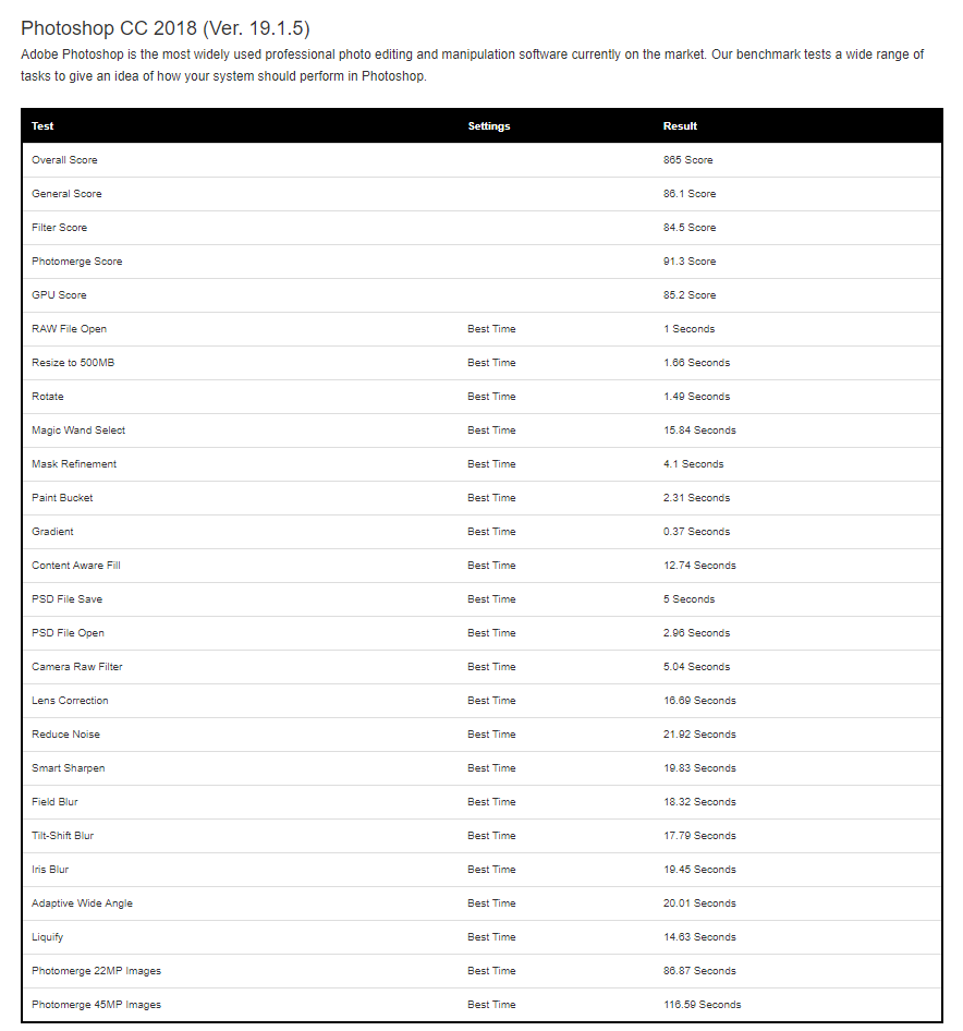 Since this system was designed mainly for content creation, below you can see Puget's Photoshop benchmark results as an example.