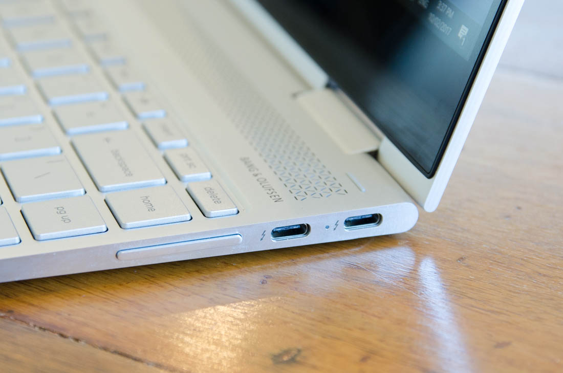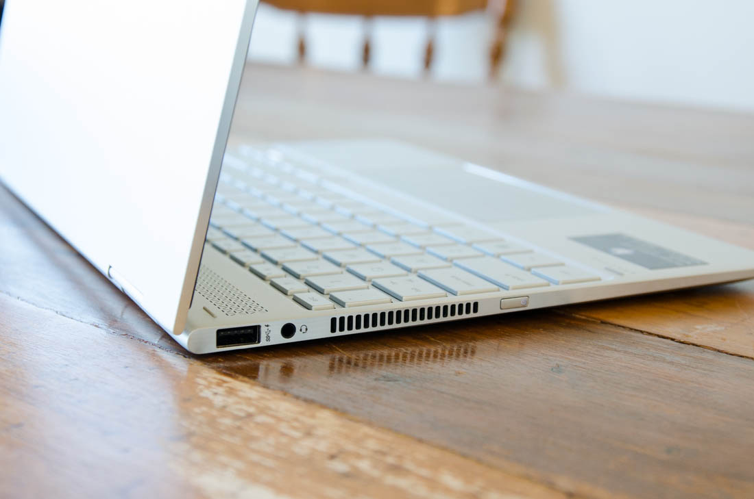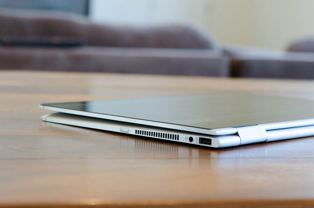 HP has opted for a wedge-shaped base similar to the old MacBook Airs, which leaves little room for ports. Despite the thinness of this laptop and its clear space constraints, HP still managed to cram a full-sized USB port on the left side, as well as two Thunderbolt 3 USB-C ports on the right side. Having two USB-C ports is particularly handy as it allows you to charge the x360 and use a Thunderbolt 3 device simultaneously without any dongles, while the inclusion of USB-A is great for legacy peripherals.