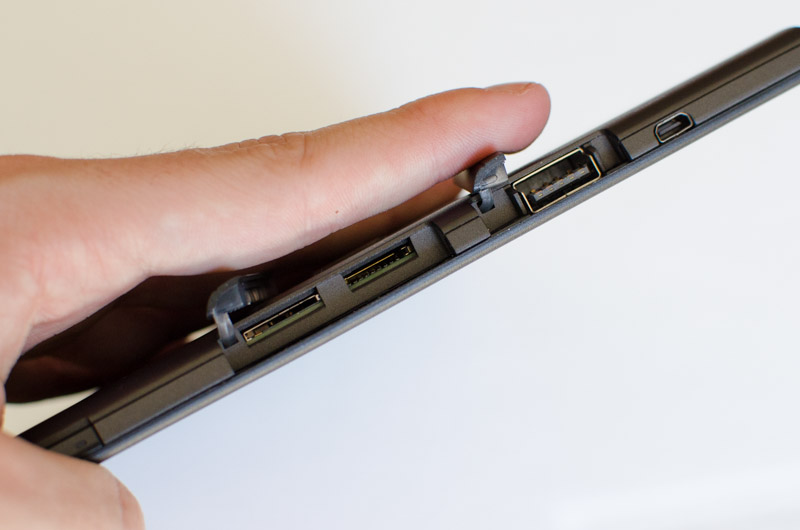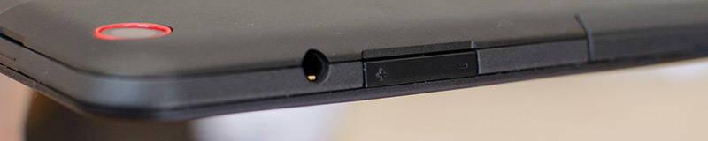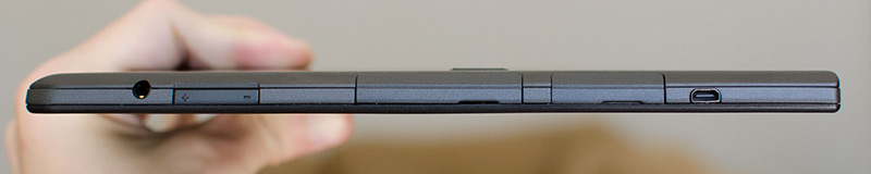 A second flap is located just above the flap containing the USB port, underneath which you'll find both a micro-SIM slot (in supported devices) and a microSD card slot. Also along this side is the 3.5mm audio jack, volume buttons, and a micro-HDMI port for directly connecting to external displays. Along the left edge is a single port that is used for charging the Helix through a proprietary connector. Power and rotation lock buttons are found on the right side of the top edge in a relatively easy to reach location.