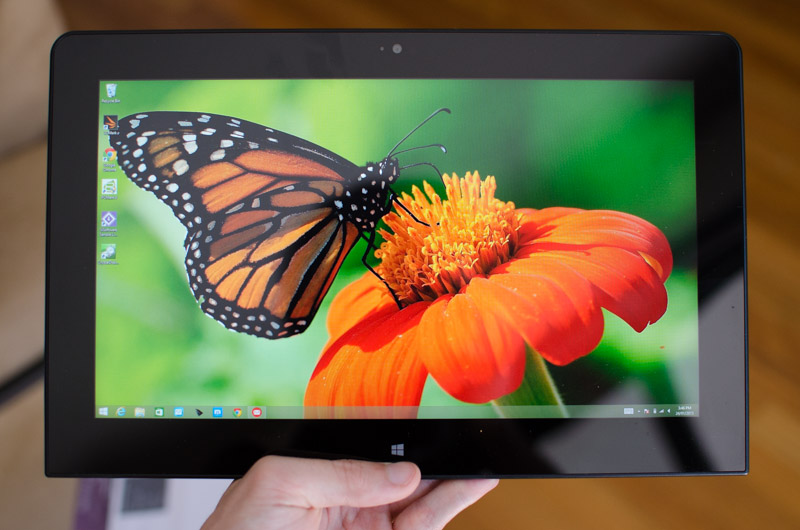 The 11.6-inch display sits in the center of the front panel with reasonably-sized bezels, allowing you to hold the tablet portion of the Helix without accidentally touching the screen. If you look closely you'll realize this isn't a standard rounded rectangle, with sharper corners on the bottom edge than the top so it doesn't look strange while seated in either of the two keyboard docks.