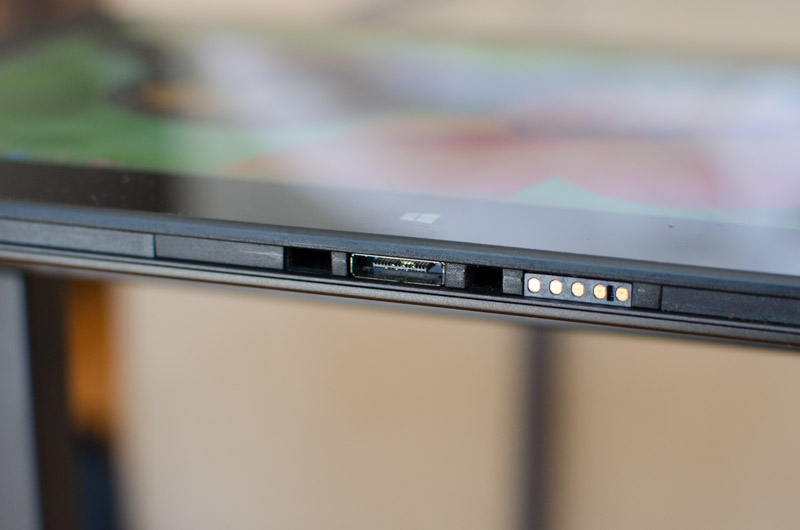 While most of the Helix tablet's edges are curved to an extent, the bottom edge is largely flat to accommodate a series of connectors that allow it to dock into the supported keyboards. There are four holes for alignment, several magnets, a selection of gold contacts and a physical connector. The physical connector is reserved for the Ultrabook Pro keyboard with its HDMI out port, while the contacts are used for the basic keyboard.