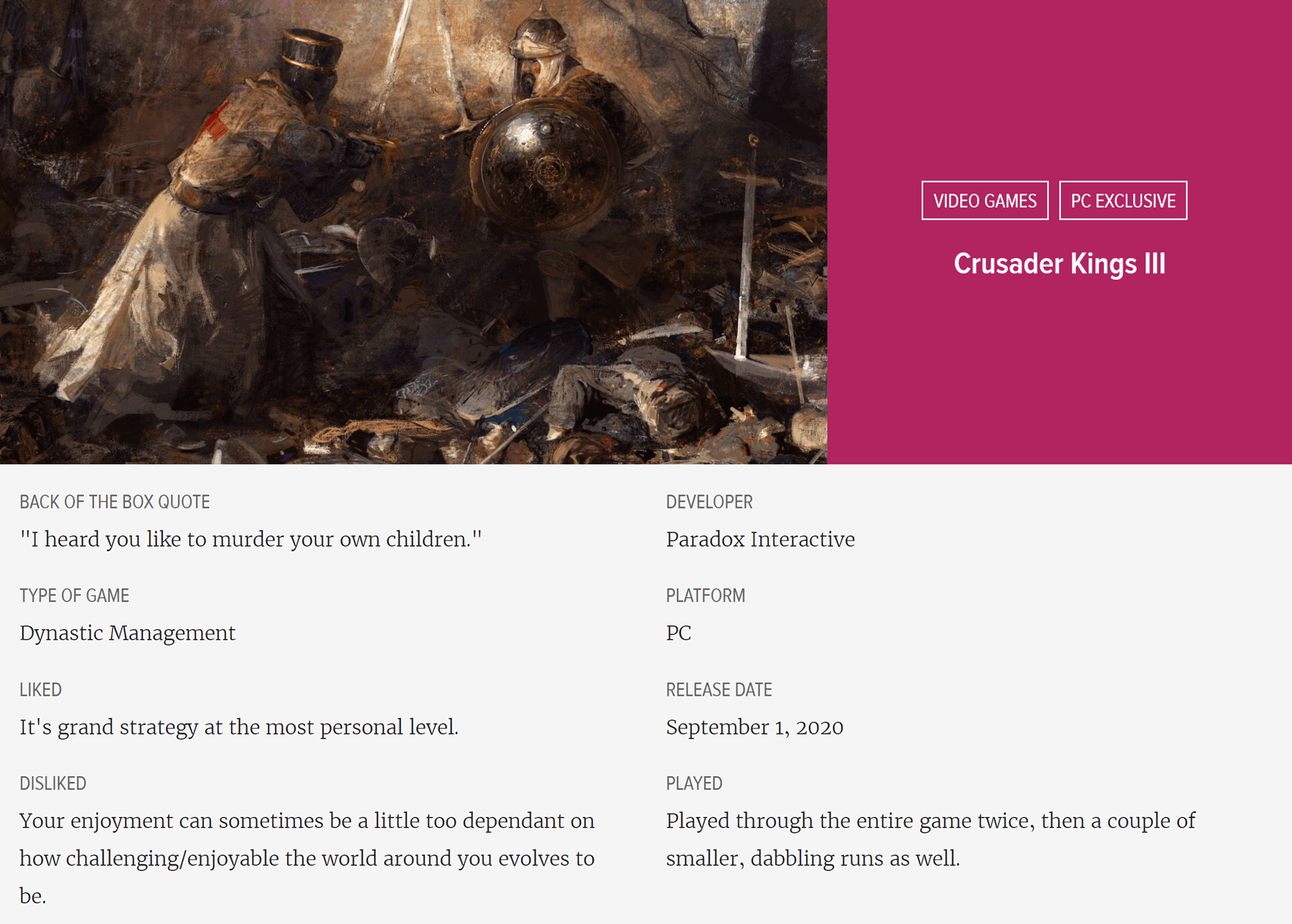 Crusader Kings III is the direct sequel to 2012's Crusader Kings II, which I nominated for Kotaku's Game of the Year back then, and then for around five years after that as well. At first glance it was just another Paradox Interactive grand strategy game, like Hearts of Iron or Europa Universalis, something terribly niche and with all the buttons and menus and abstract complexity that implied.