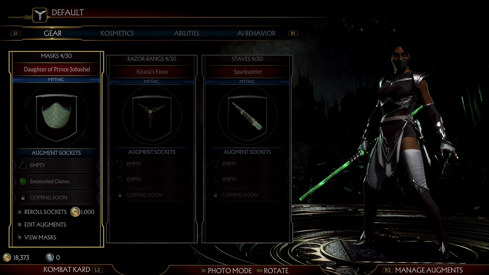 A major, welcome new addition to Mortal Kombat 11 is the ability to create custom variations of the game's characters. Players select a character, choose a costume and assign three pieces of modifiable gear. My custom Jade is wearing the white and gray "Kamanchaka" skin with the "Daughter of Prince Jobashel" mask, "Kitana's Favor" razor-rangs and a staff called "Sparkspitter."