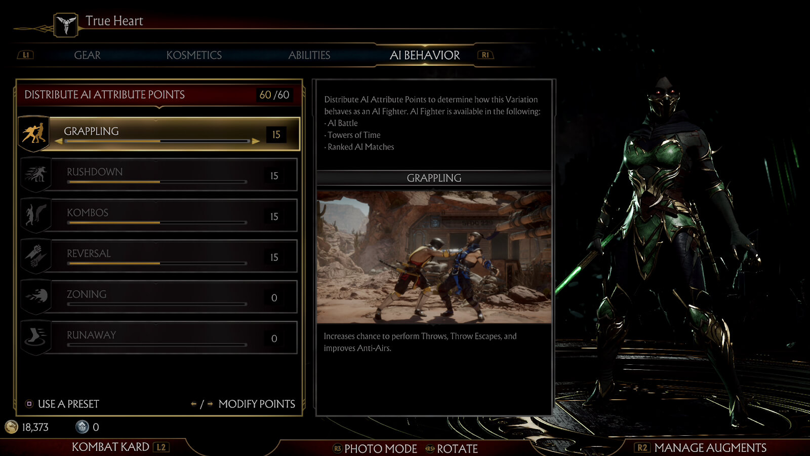 Each A.I. character has 60 points to spread across five attributes: grappling, rushdown, kombos, reversal, zoning and runaway. How those 60 points are distributed determines how the AI character performs.