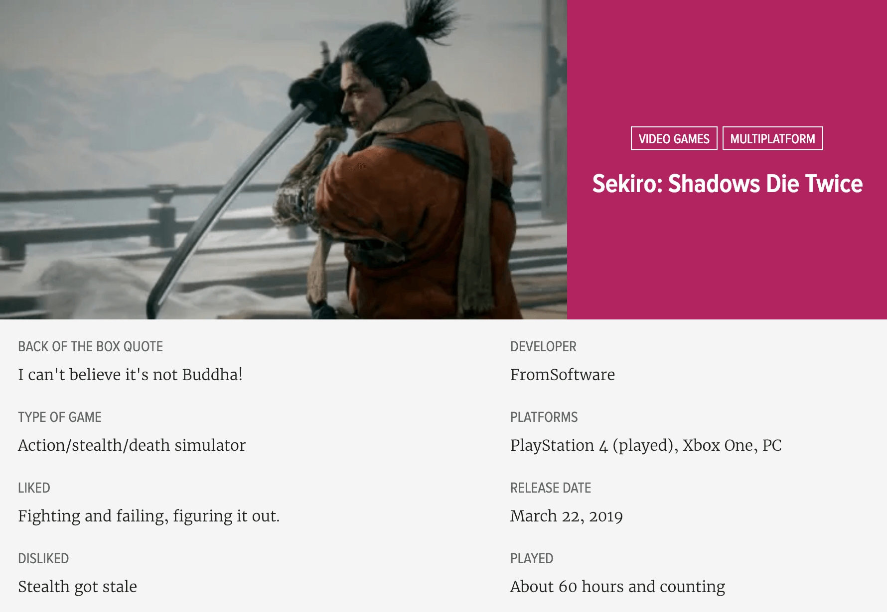 Sekiro gets a whole lot right. Its themes permeate its feudal Japan in a compelling way, and for the most part, the gameplay is deeply satisfying. There are things it could do better, particularly avoiding repetition, but the notes Sekiro does hit are memorable enough that the slog doesn't totally ruin the flow of gameplay, and the inertia into the end of the game carries strong. The challenge Sekiro presents is daunting and time-consuming. Ultimately, the question I had coming in was, "Will this be worth it?" After moving through countless cycles of life and death, tensing, raging, and finally, conquering my challenges and letting go of my anger like Buddha, I decided that it was.