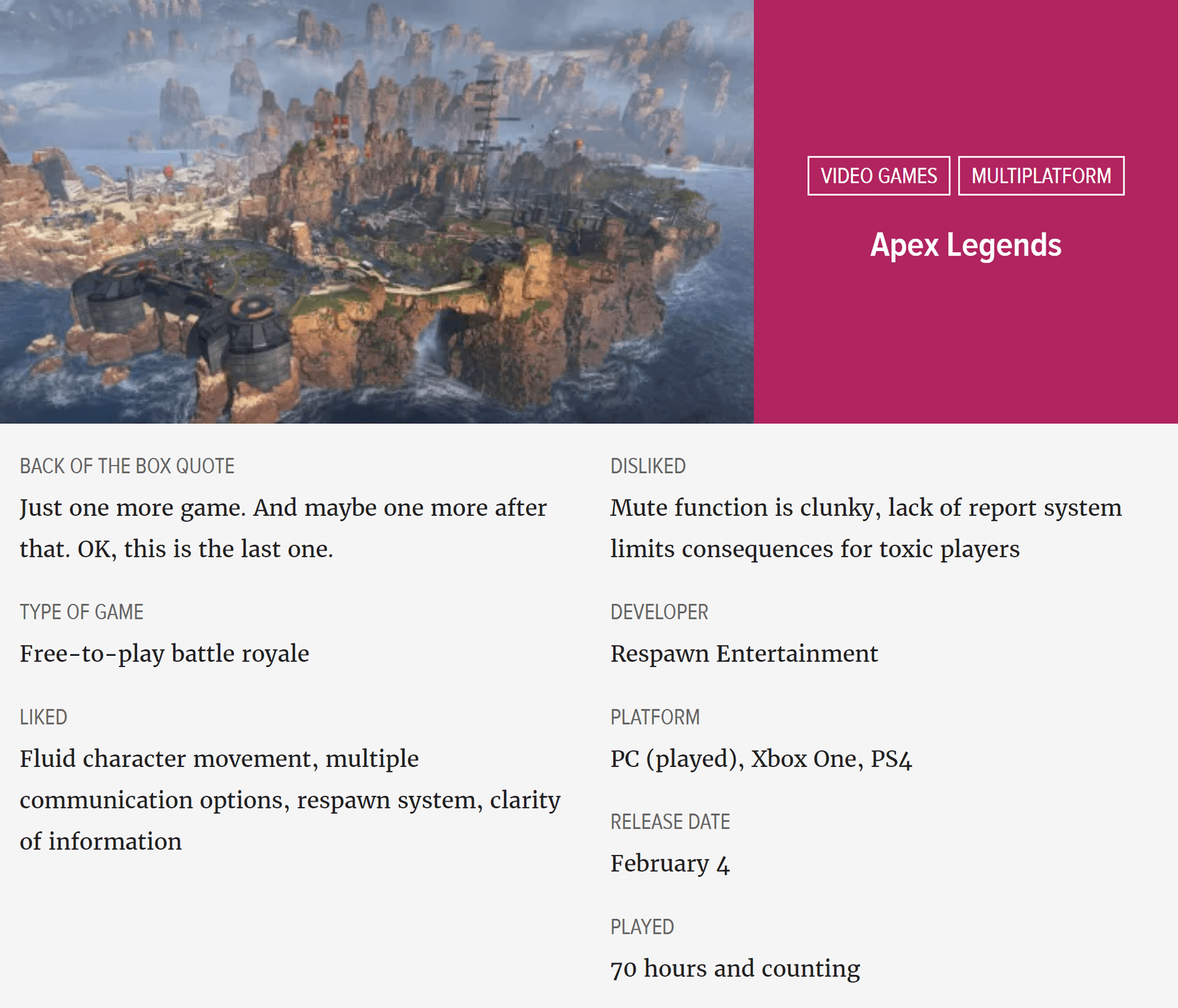 When gunfire sounded nearby, my heart leapt into my throat. I urged them to hang back as I scouted up ahead, feeling the full weight of their first experience of the game upon me. When they started shooting despite my advice---kids these days!---I leapt into action. I ziplined across a ravine and slid into cover to the enemies' flank, then popped out and drew fire. I danced between buildings and pinged enemies, attracting as much attention as I could. Eventually I was downed, and they both died seconds later. I turned the game off immediately, feeling way more intense emotions than I expected or even necessarily wanted from a quick turn through a battle royale. But it was also a better match than I had ever played before: riskier, more tactical, more meaningful. For that one match, Apex Legends brought out my best.