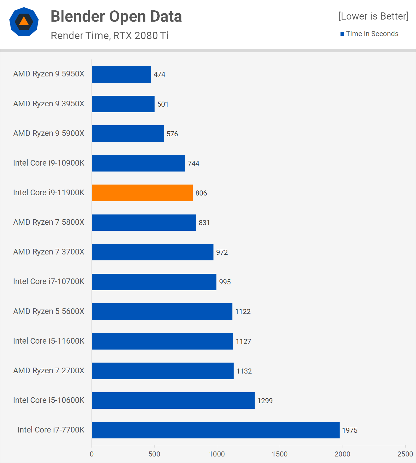 Moving over to the Blender Open Data benchmark, we see that the 11900K is slower than the 10900K again, trailing by an 8% margin. Obviously though if you have ~$500 to spend on a CPU and you'll be doing a lot of core-heavy productivity tasks like rendering, the 5900X is the way to go and here the Ryzen 9 part offers 40% more performance.