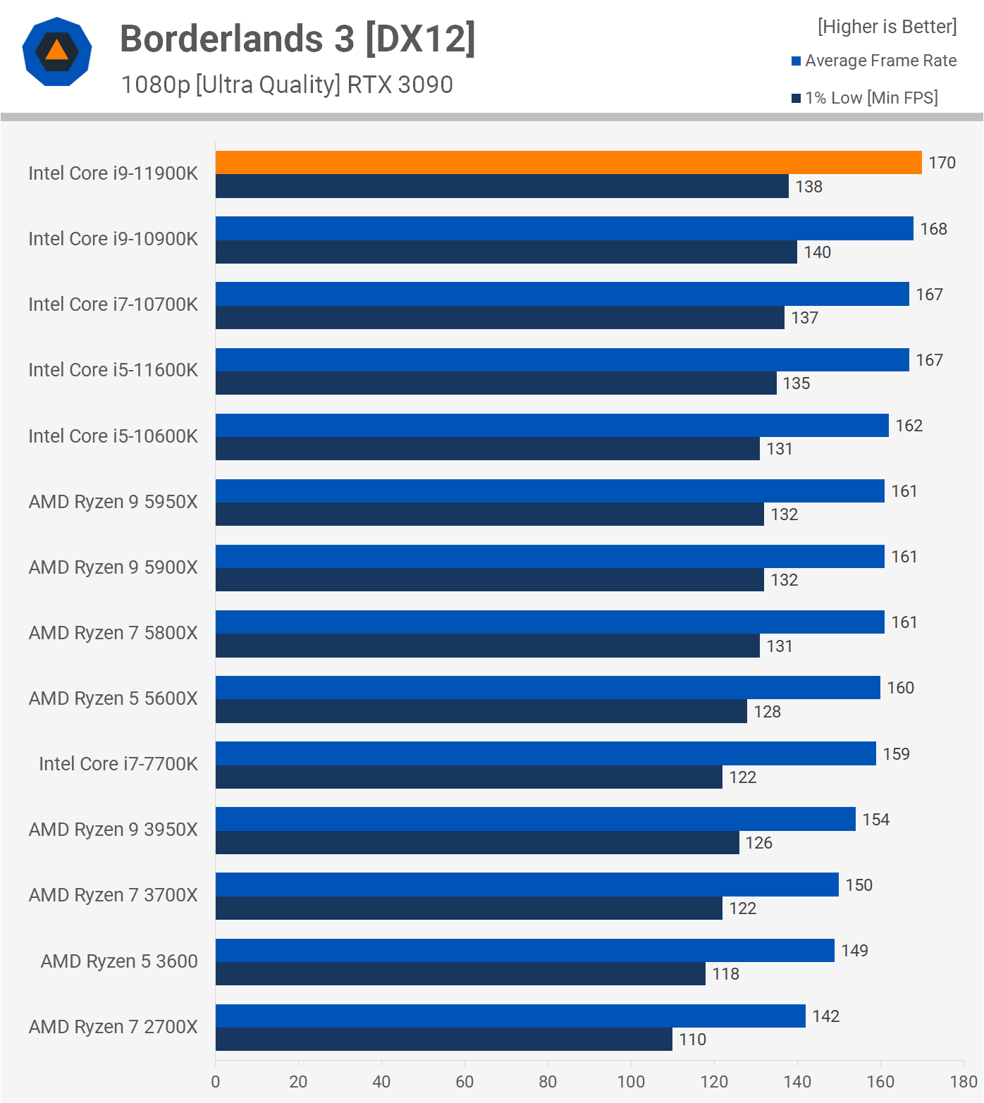 The 11900K also matches the 10900K in Borderlands 3 making it 6% faster than the 5900X which is a small margin, but also a clear win for Intel in this title.