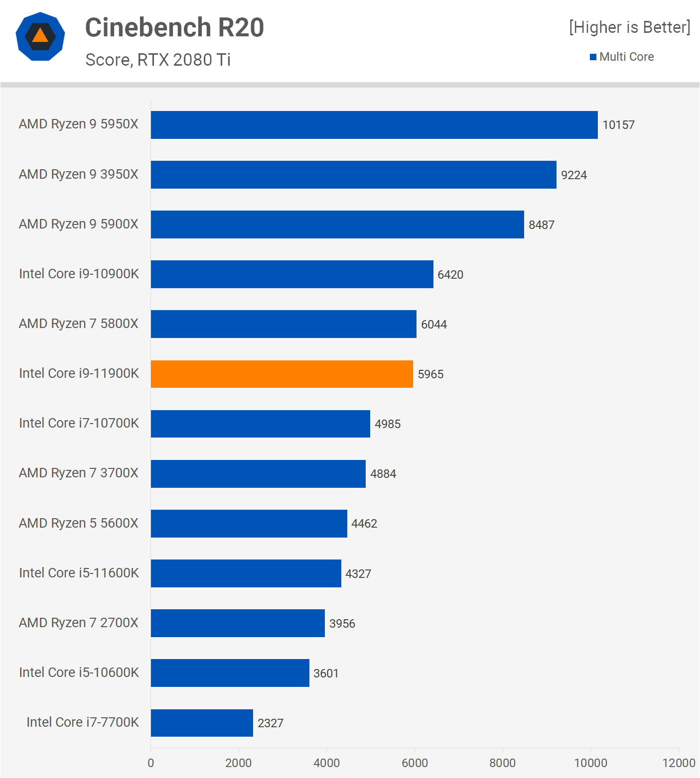 When looking at single core performance we see that the 11900K is 14% faster than the 10900K, and just barely behind the 5900X. For single or lightly threaded workloads the 11900K is unlikely to beat the 12-core AMD processor.