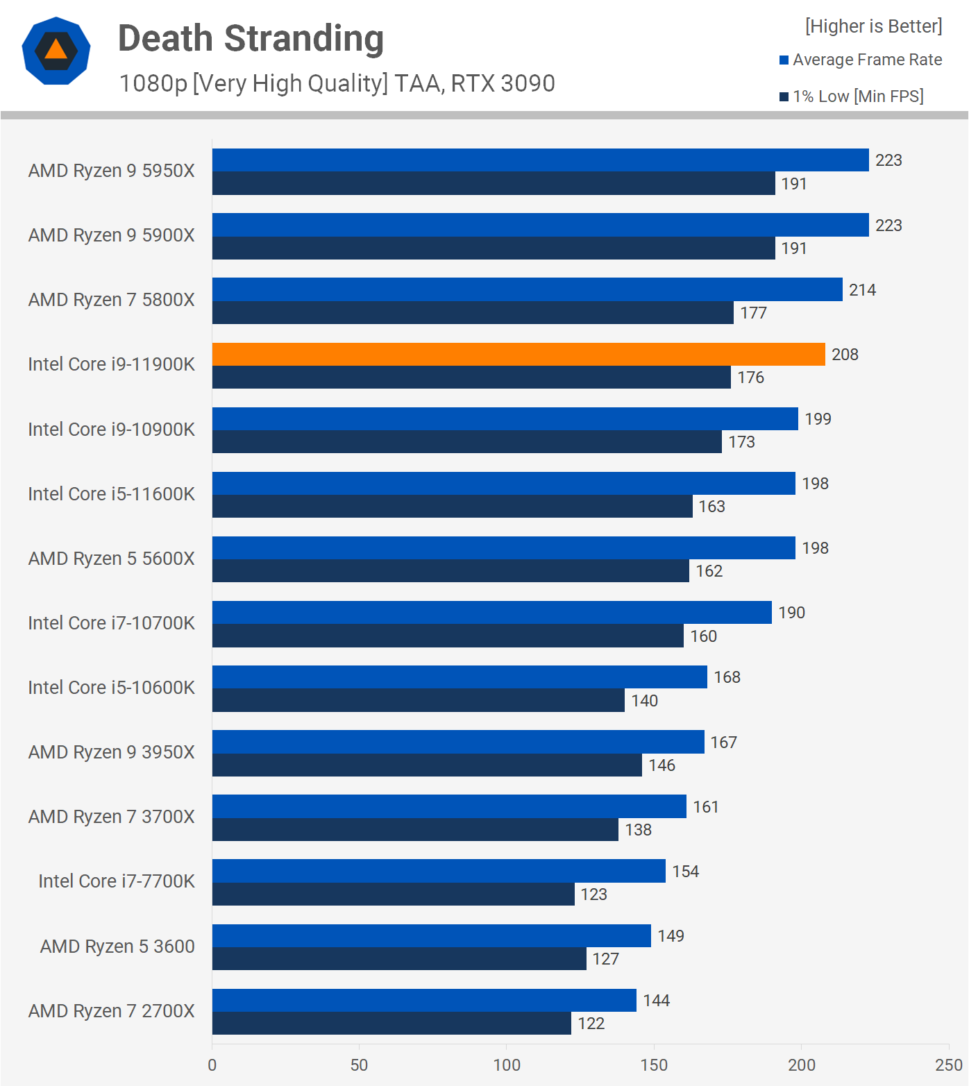 Moving on to Death Stranding, we see the 11900K edging out the 10900K by 5% but unfortunately still 7% slower than the 5900X.