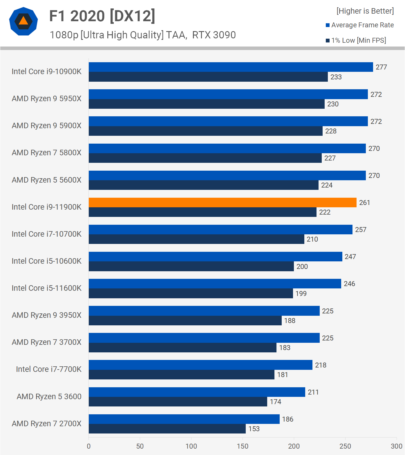 Here's a look at the 10 game average which shows that Intel is not taking the gaming crown with their 11th-gen Core series, at least not based on our sample of games. In fact, they've managed the rather unimpressive feat of reducing overall performance as the 11900K came in 2% behind the 10900K.