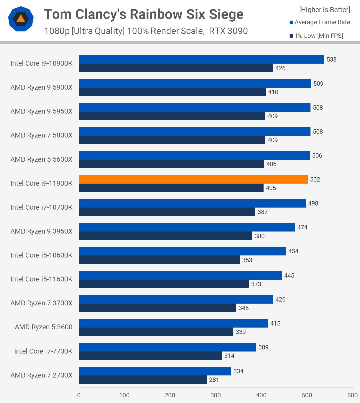 The Core i9-10900K was a bit of a beast in Rainbow Six Siege and while you can certainly argue the relevance to 538 fps, it remains the fastest CPU in this game. We're seeing the same situation where the 11900K ends up reducing performance, dropping frame rates by a 7% margin to come in just behind the 5900X.