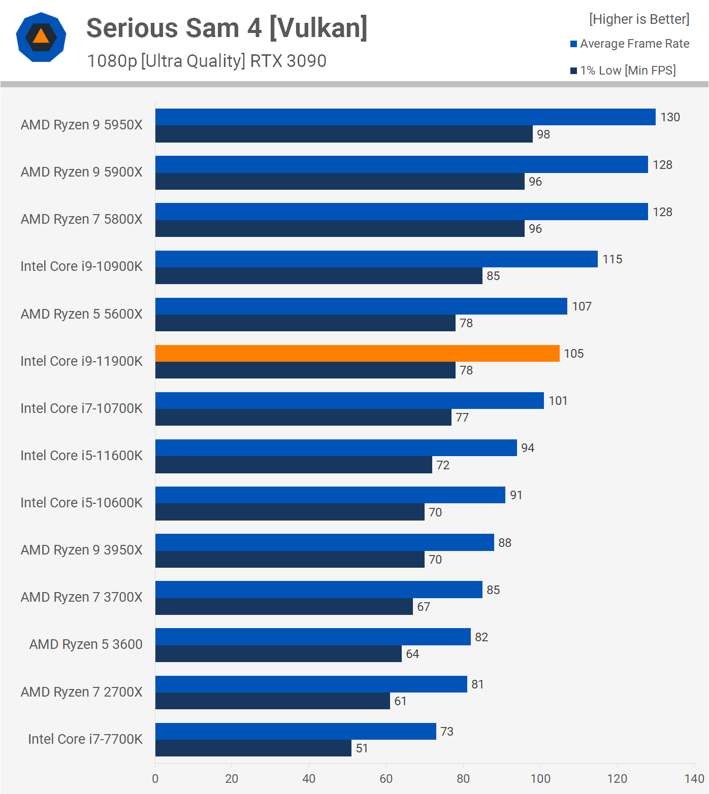 Serious Sam 4 is another example where the 11900K ends up being a step backwards for Intel as it loses out to the older 10900K by a 9% margin. Worse than that is the 18% loss it suffered to the 5900X.