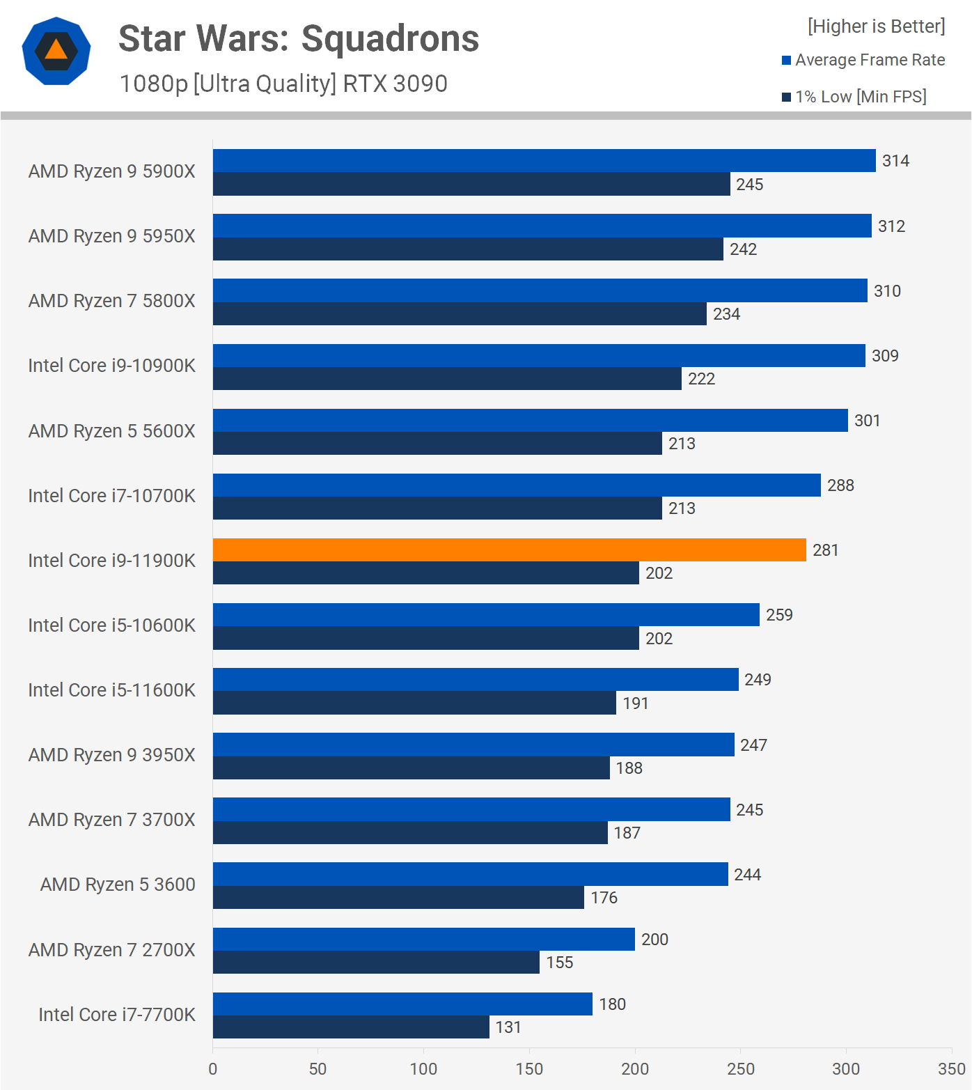 The Star Wars: Squadrons results are a bit brutal. Here the 11900K is 9% slower than the old 10900K and 11% slower than the 5900X by. So not a good result for Intel's new flagship Core i9 processor.