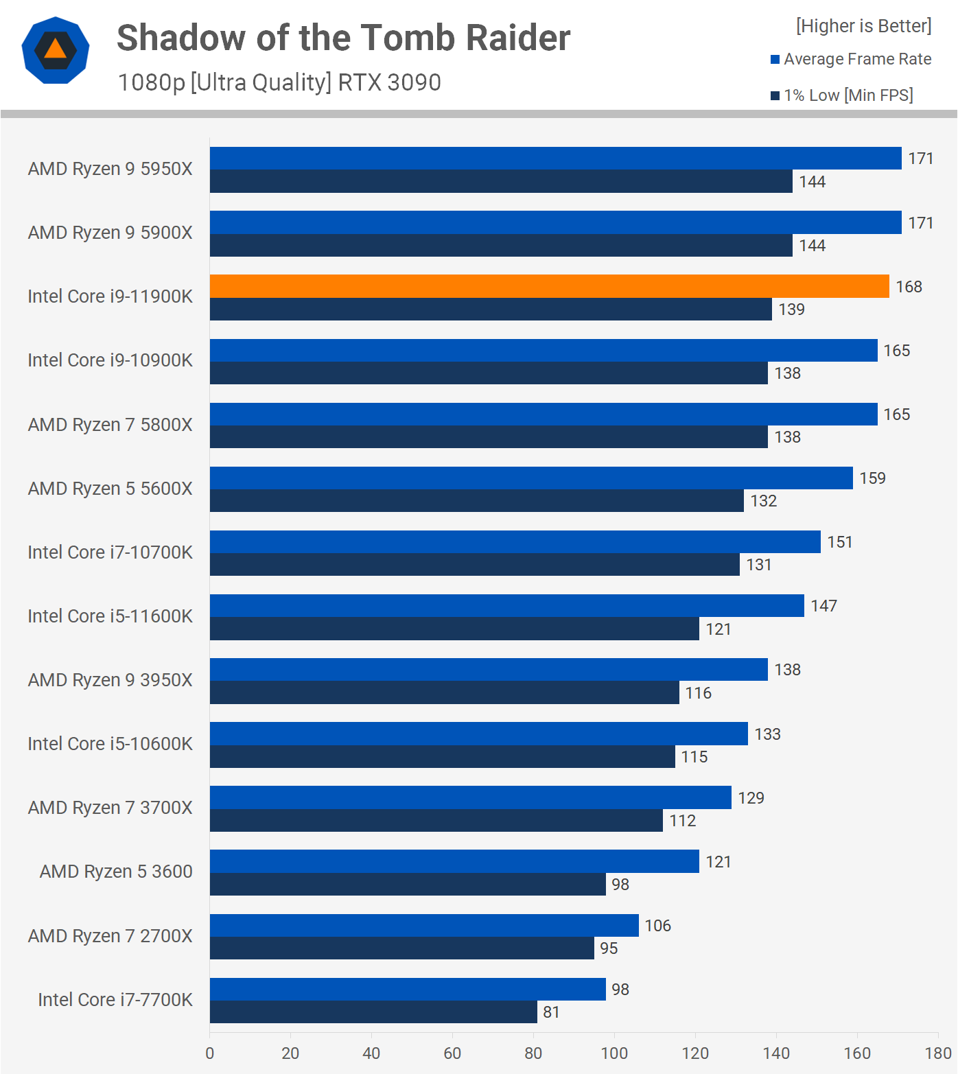 Last up we have Shadow of the Tomb Raider where the 11900K is 2% faster than the 11900K, but hey at least it was faster, managing to match the 5900X as well.