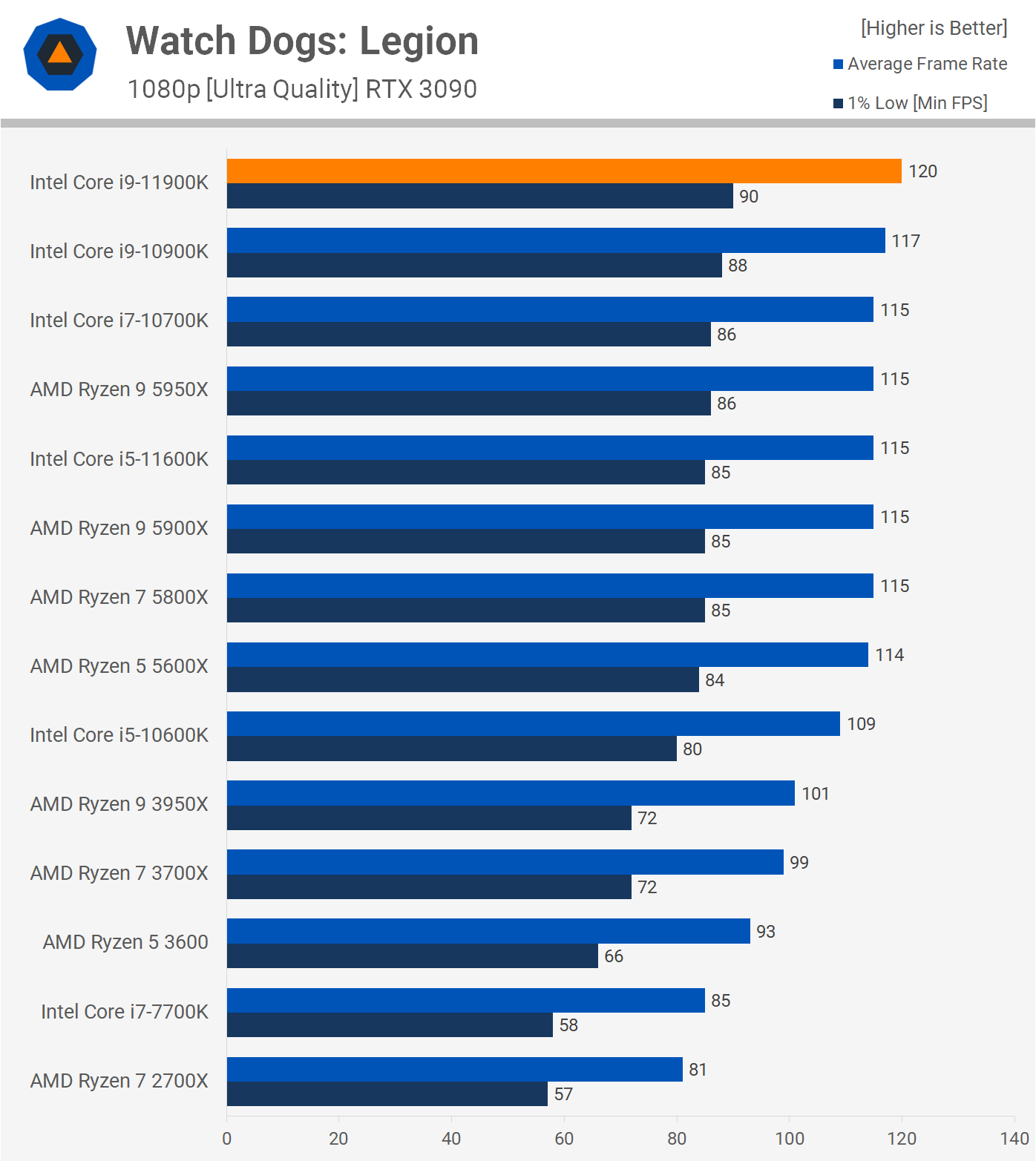 Kicking off the gaming benchmarks we have Watch Dogs Legion. Here the 11900K manages to make its way to the top of our chart, boosting performance from the 10900K by 3%. Not exactly an exciting margin, but it's better than the alternative. The 11900K is also 4% faster than the 5900X.