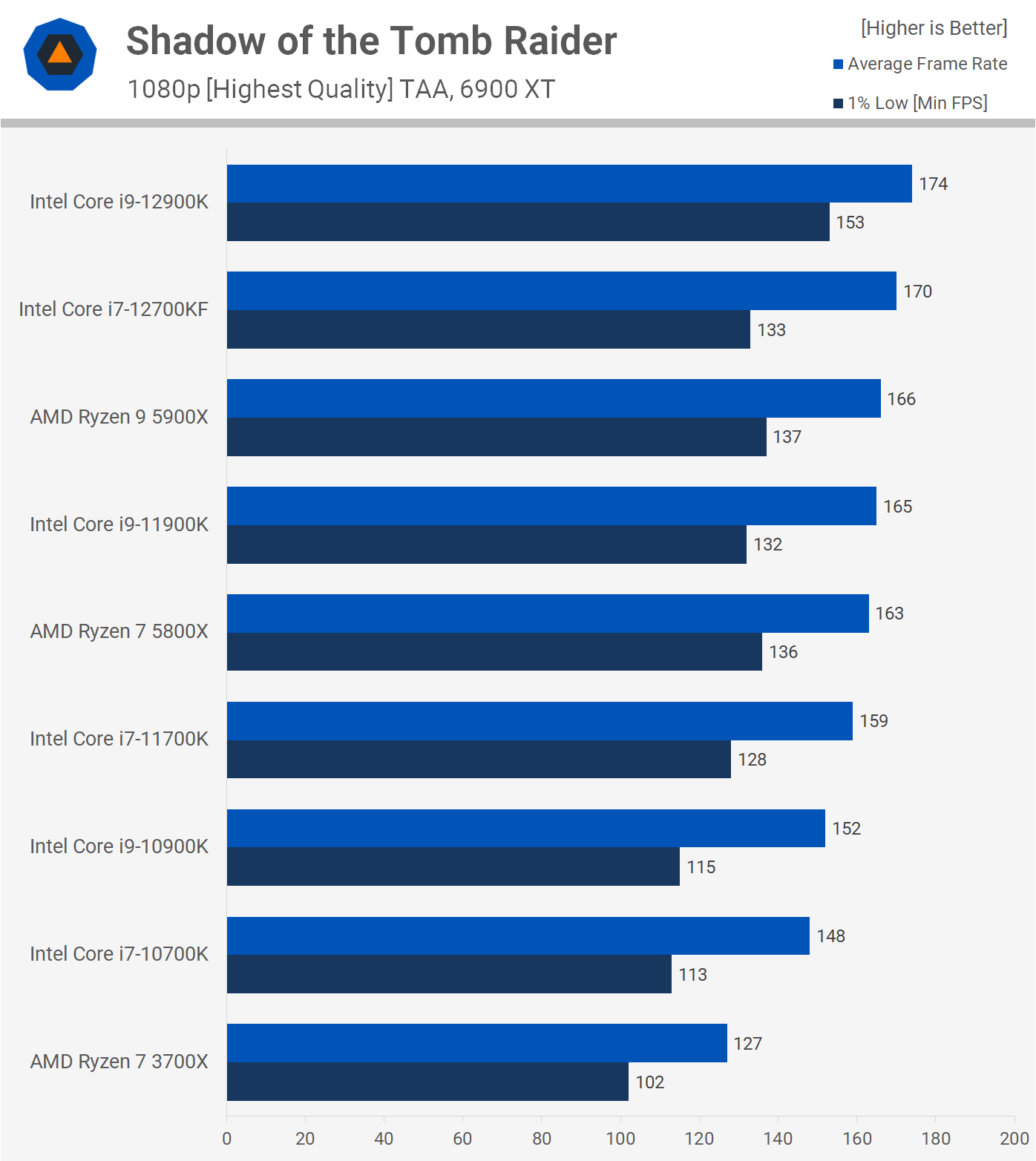 As we said in our 12900K review, there's no tangible difference in gaming performance between most of these high-end CPUs as you'll almost always be GPU limited in today's games, even with an RTX 3090 or 6900 XT at 1080p with dialed-down quality settings.