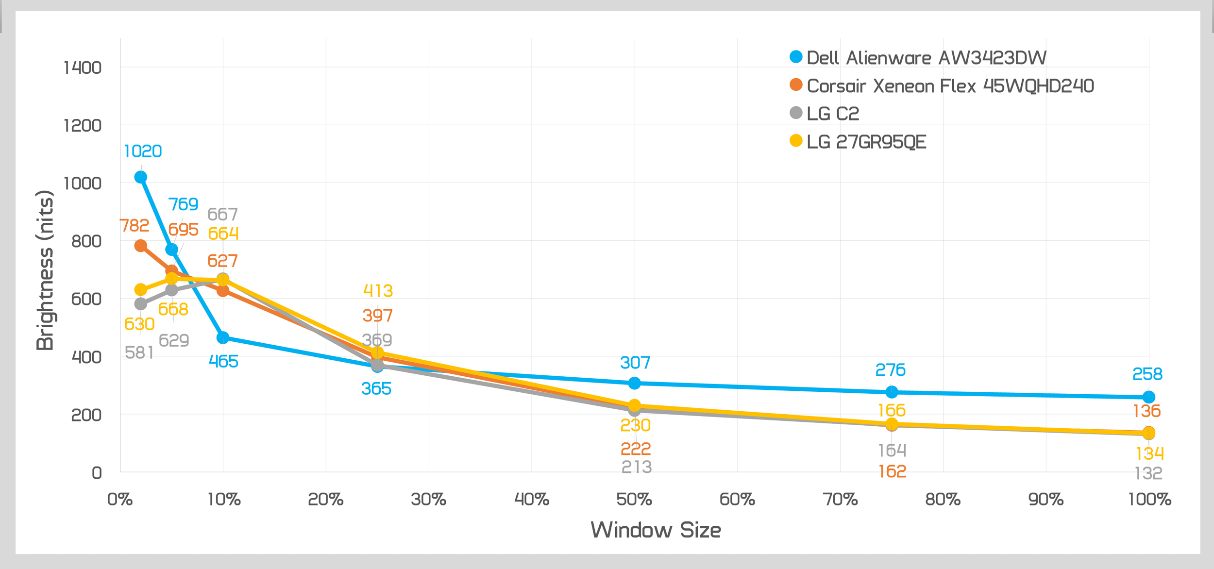 When looking at a 10% window size, the Flex was one of the least impressive WOLED panels I've seen so far, at just 627 nits, below even the 27GR95QE, though above QD-OLED competitors. However brightness does improve to as high as 788 nits for a 2% window, which is a little different to other monitors. The 27GR95QE for example stays relatively consistent at smaller windows than 10%, while the LG C2 somewhat falls away. The Flex increases in brightness and does outperform some of its competitors, though not QD-OLEDs which reach 1000 nits.