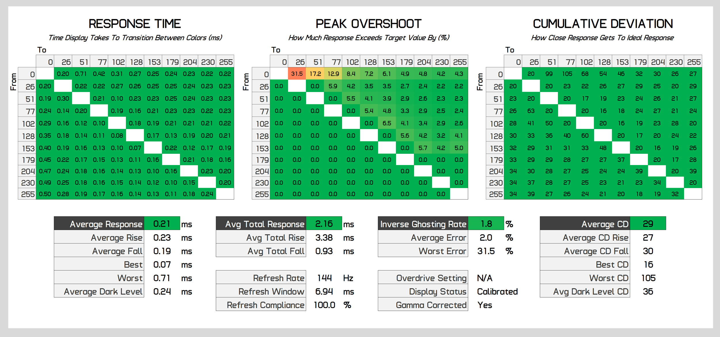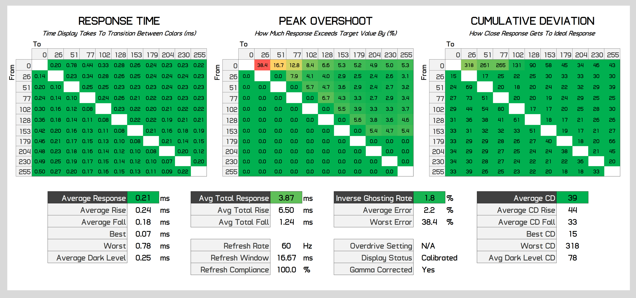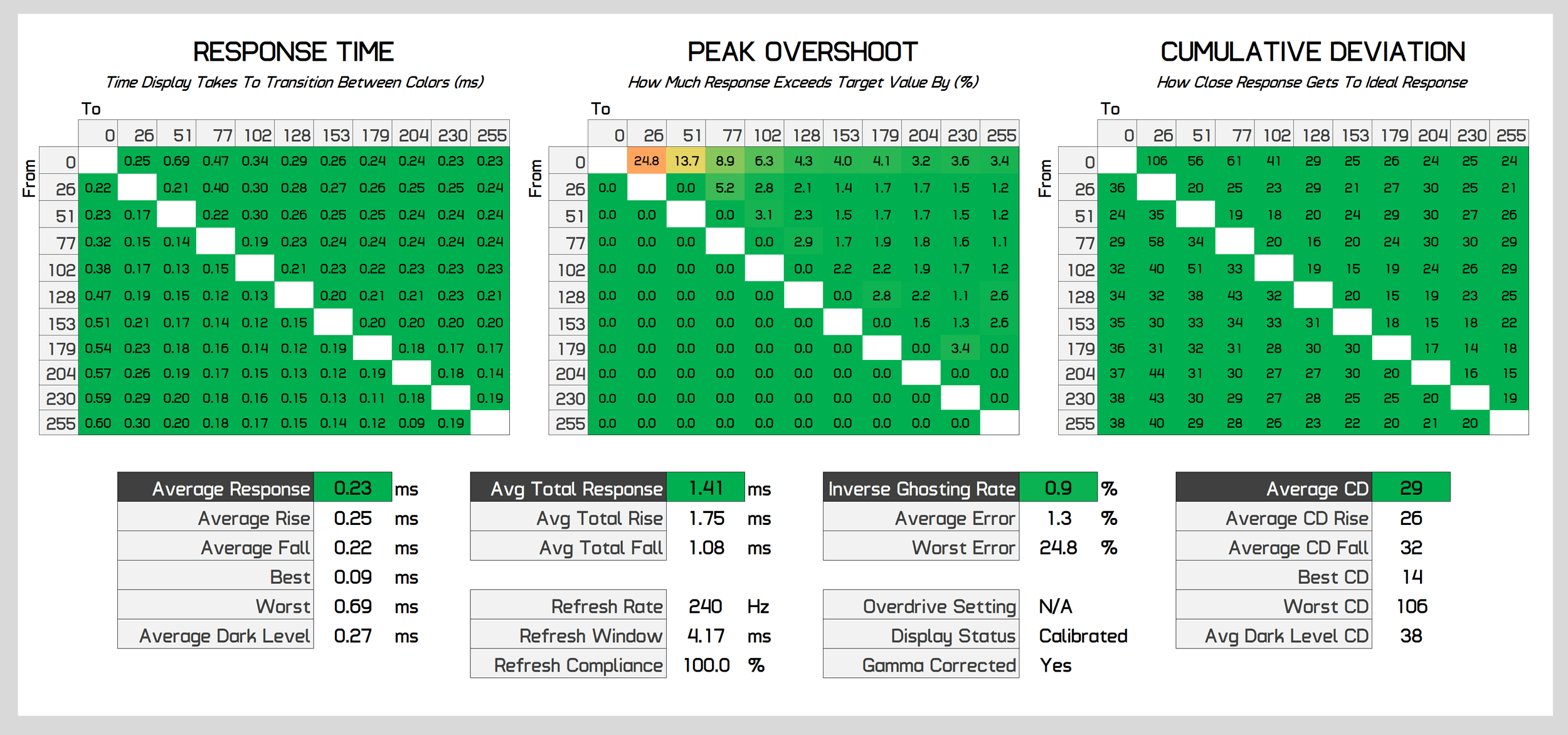 I'm not a huge fan of this product being advertised as a 0.03ms monitor as that implies over a 30x improvement in response times relative to a 1ms LCD, which is not true in practice. And 1000 nits of peak brightness in the HDR mode is not realistic under our test conditions. However this is clearly a true HDR monitor with great contrast capabilities, and motion performance is great.