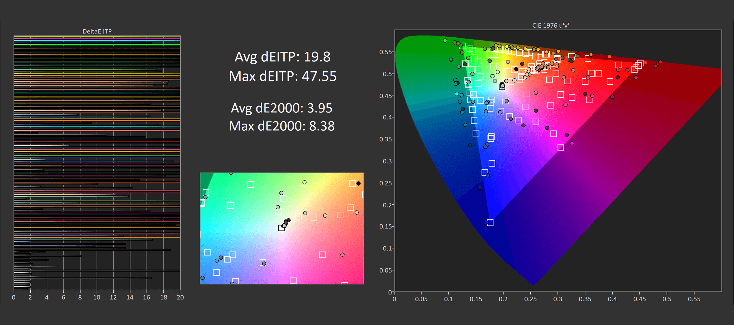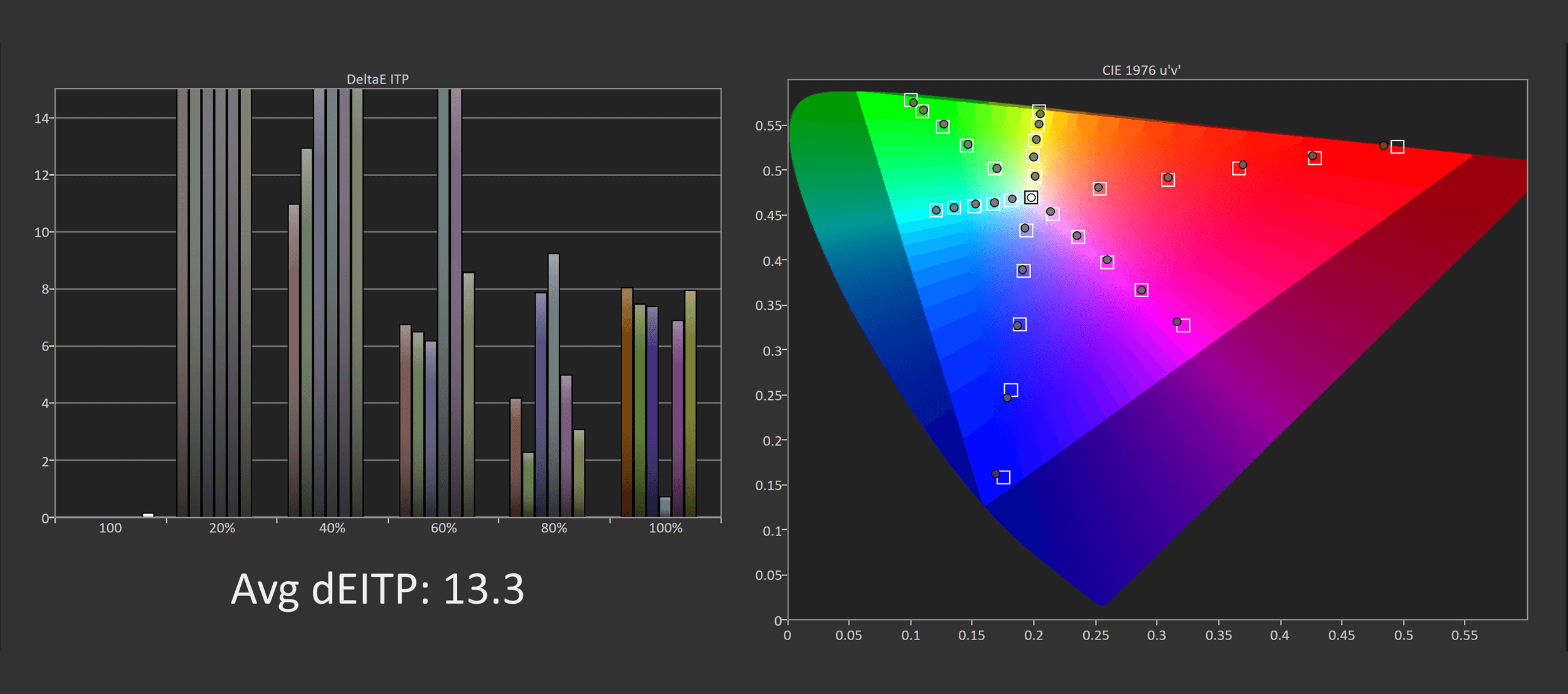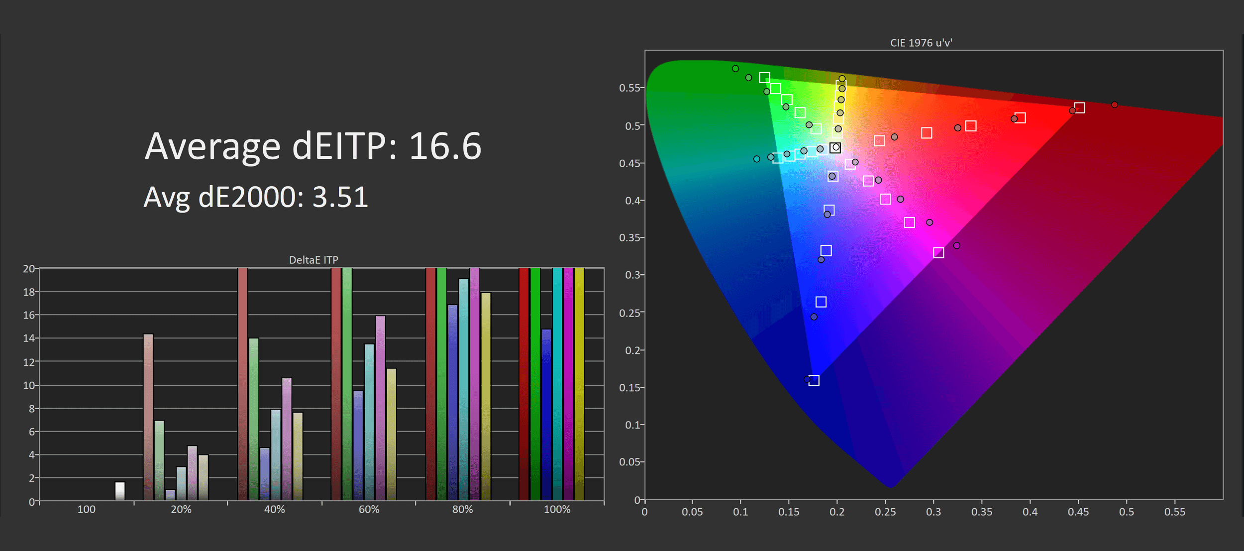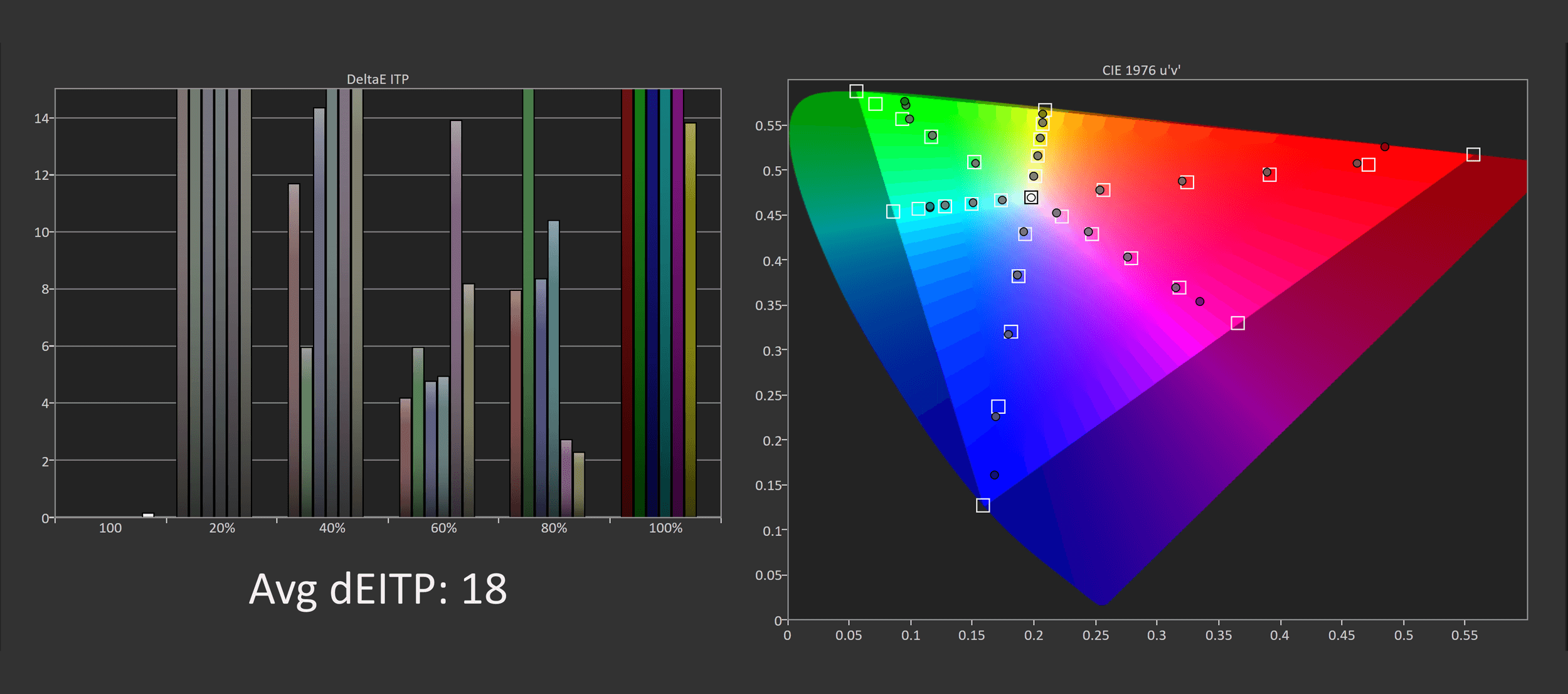 Out of the box calibration is average. While the white balance is fairly good, the bottom part of the gamma curve was too dark on my unit, leading to poor deltaE values in that range. The monitor also ships without a gamut clamp enabled by default, so when using this display in its SDR mode, there is some oversaturation as Rec.709 content like YouTube videos are expanded up to fill the P3 gamut. It's on the more minor end of the scale on this monitor, but it leads to mediocre deltaE performance.