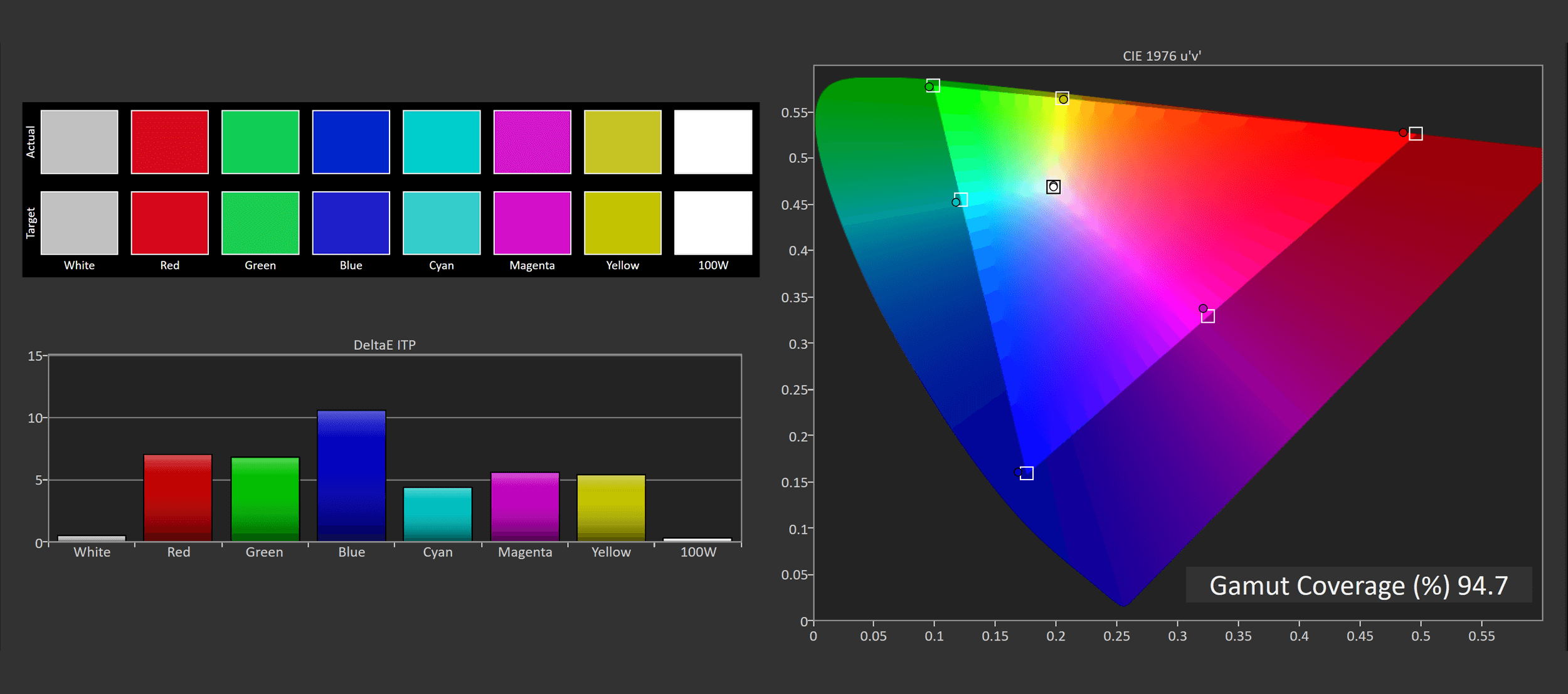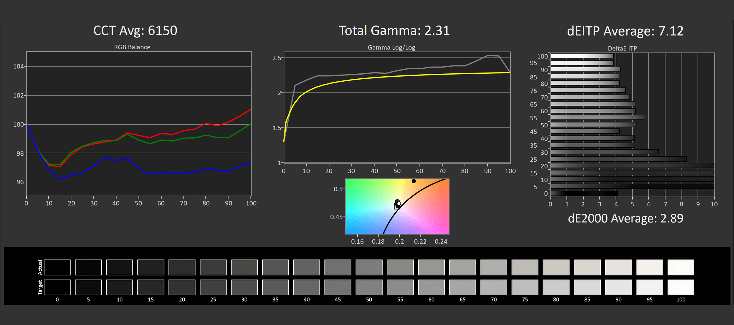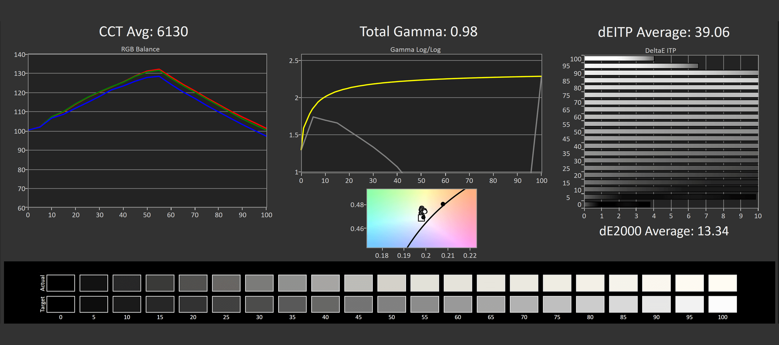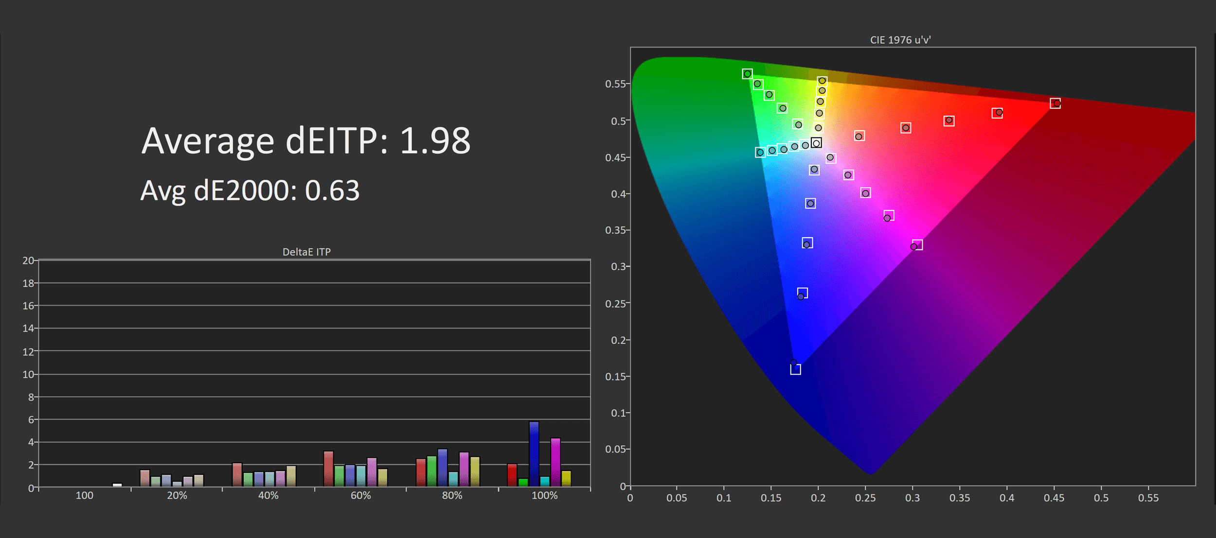 Out of the box calibration is average. While the white balance is fairly good, the bottom part of the gamma curve was too dark on my unit, leading to poor deltaE values in that range. The monitor also ships without a gamut clamp enabled by default, so when using this display in its SDR mode, there is some oversaturation as Rec.709 content like YouTube videos are expanded up to fill the P3 gamut. It's on the more minor end of the scale on this monitor, but it leads to mediocre deltaE performance.