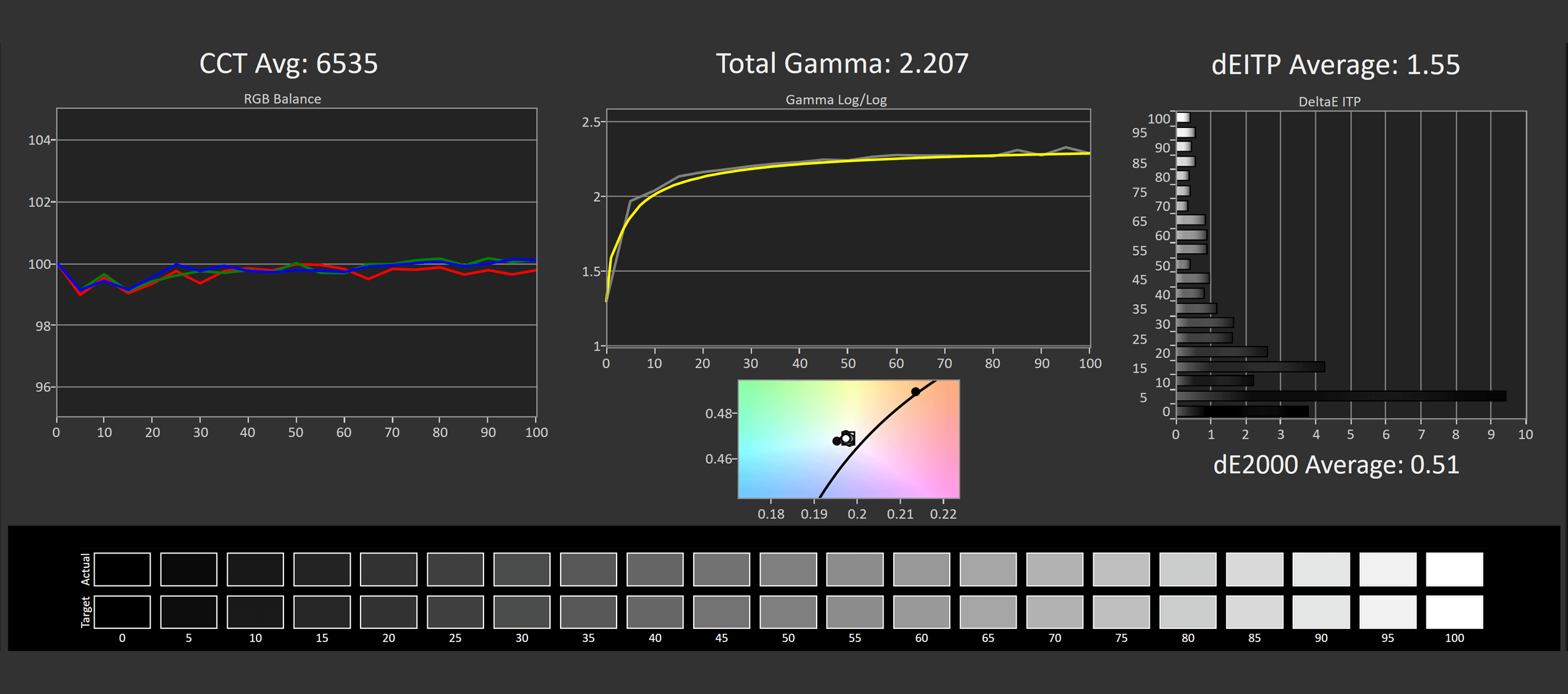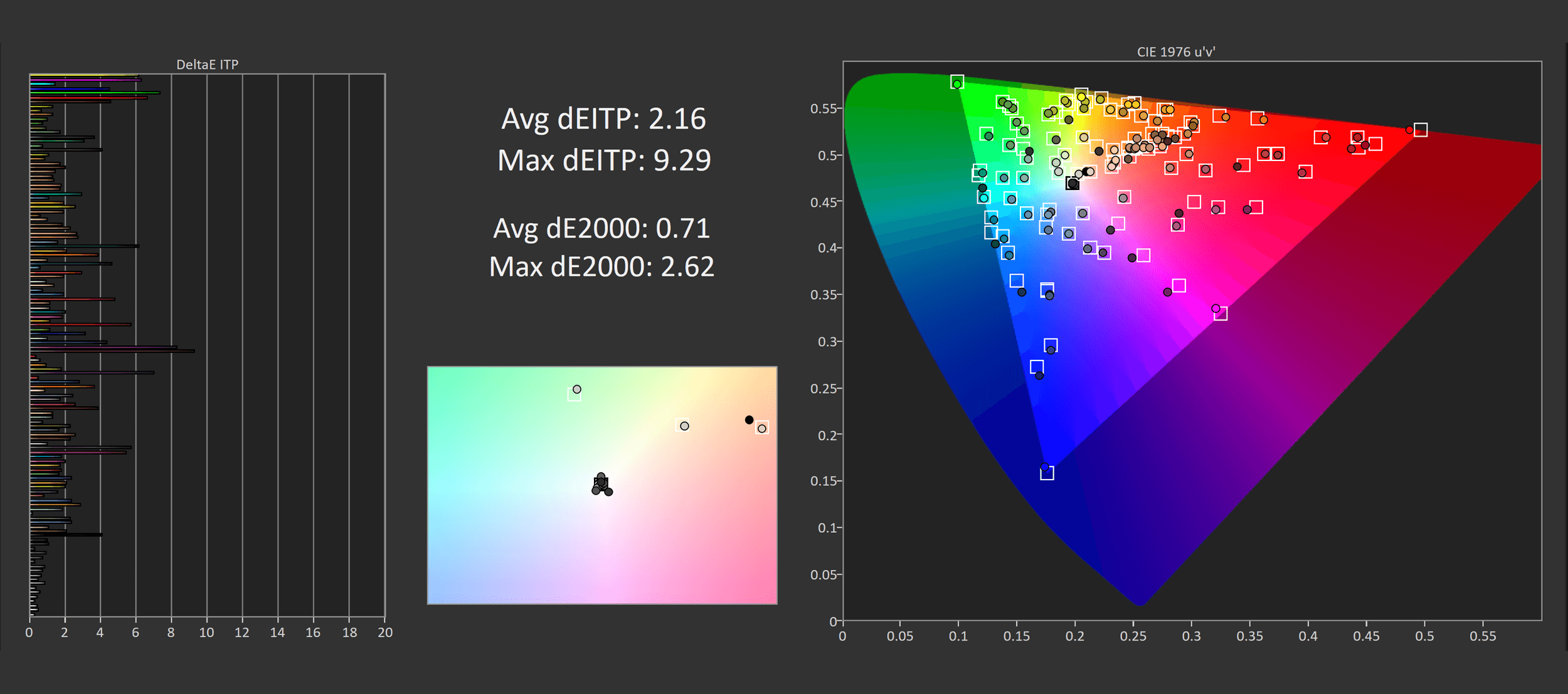 From here the best way to improve performance is through a full calibration and we use Calman for that. The results here are as expected from an OLED, and when used in conjunction with the brightness stabilizer setting we do see good performance at different APLs. However there is no hardware calibration support, so only apps that support ICC profiles will be able to benefit from this sort of tweaking.