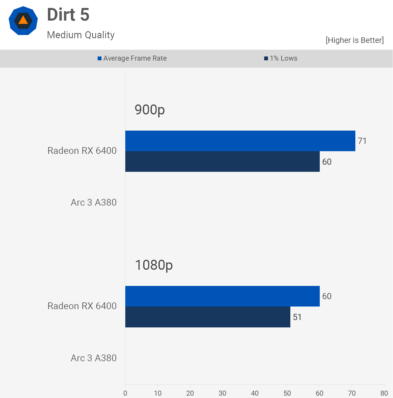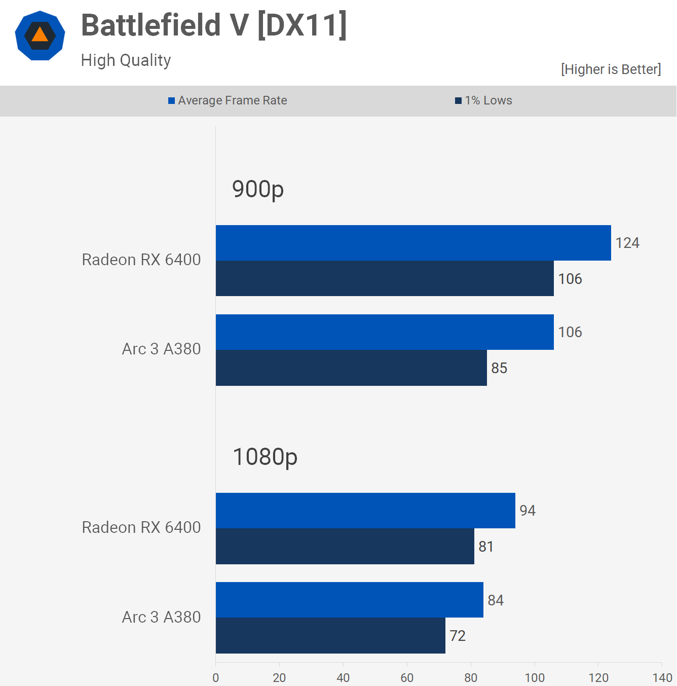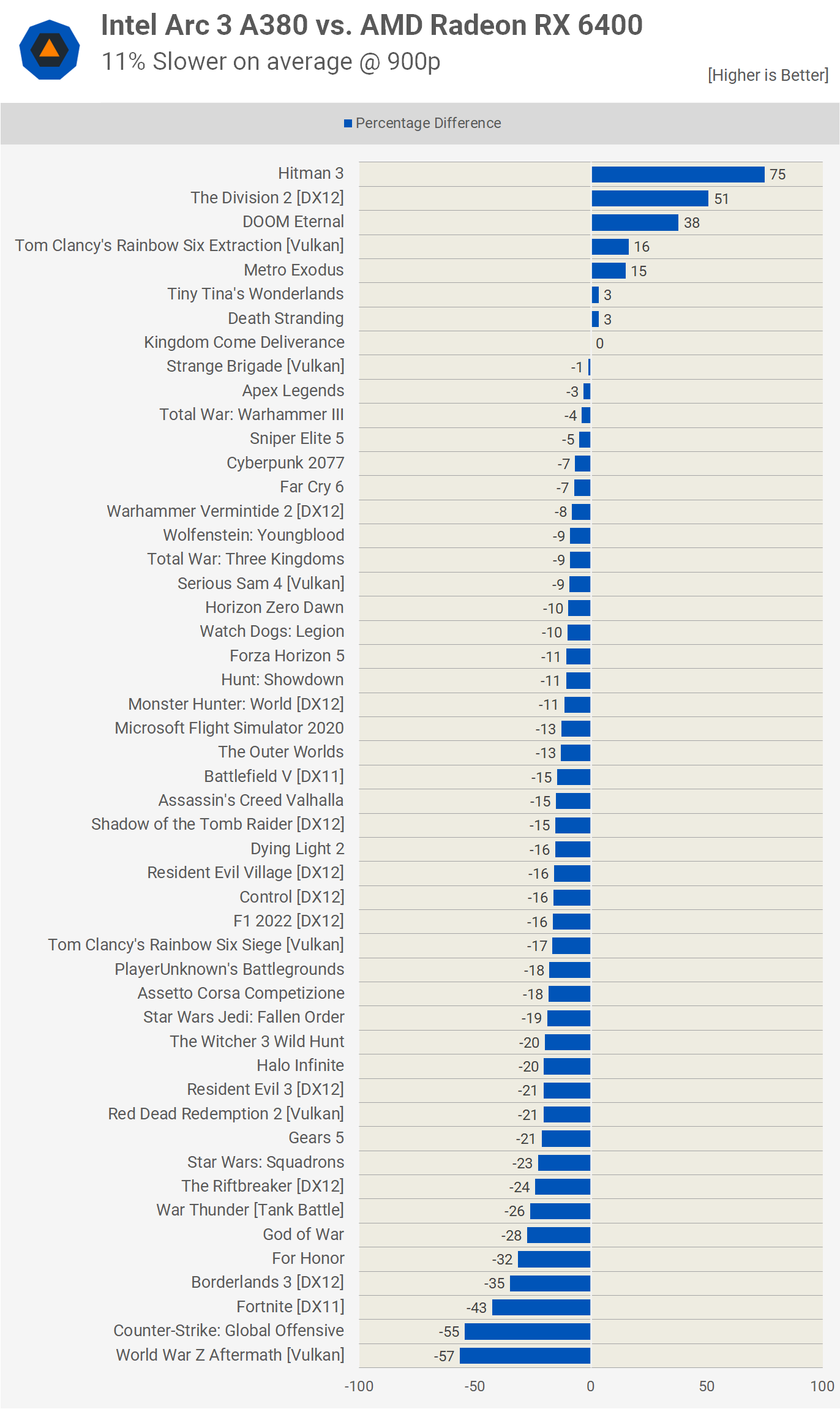 However, DirectX 12 appeared to run without issue so the A380 was benchmarked using DX12 while the RX 6400 was tested using Vulkan. The end result being a 26% performance advantage for the Radeon at 900p and 22% at 1080p.