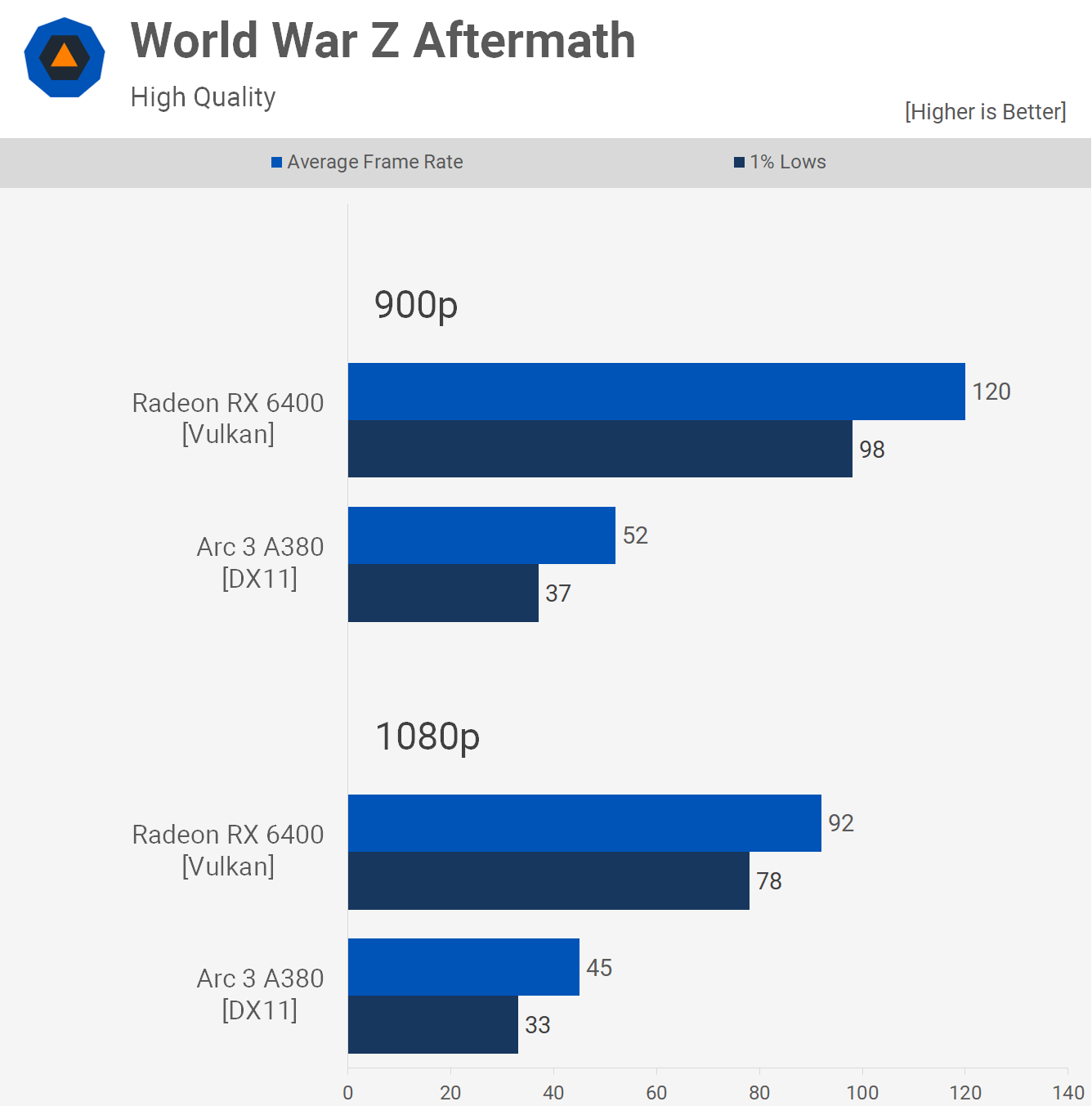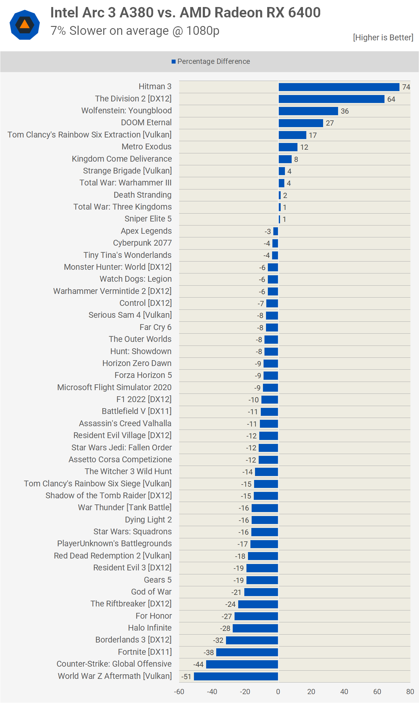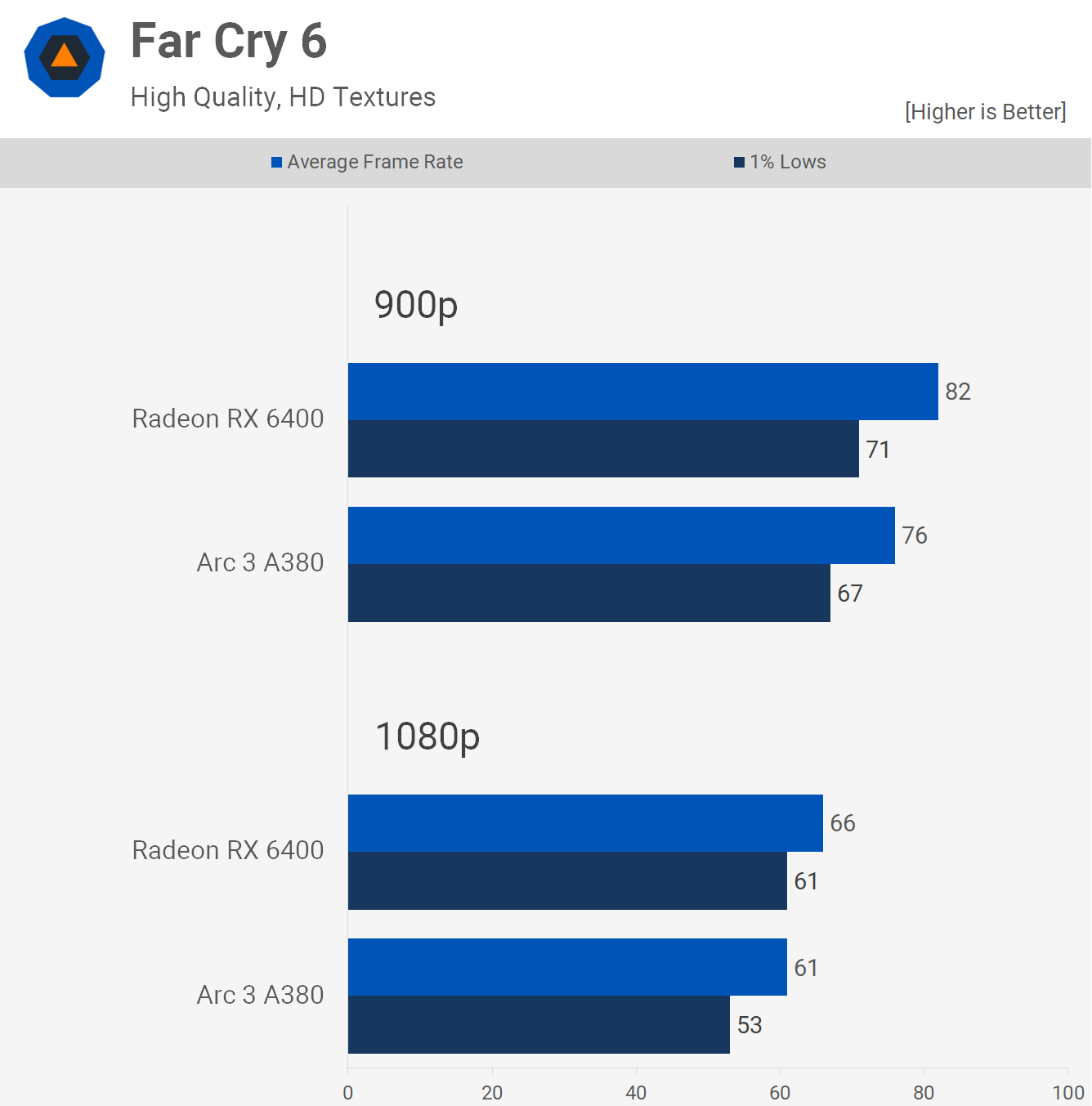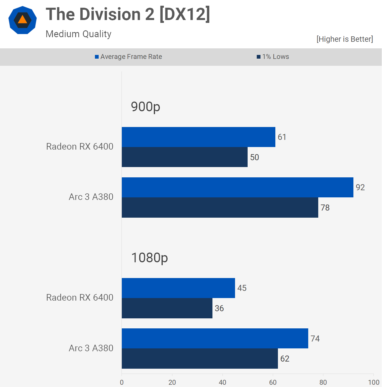 However, DirectX 12 appeared to run without issue so the A380 was benchmarked using DX12 while the RX 6400 was tested using Vulkan. The end result being a 26% performance advantage for the Radeon at 900p and 22% at 1080p.