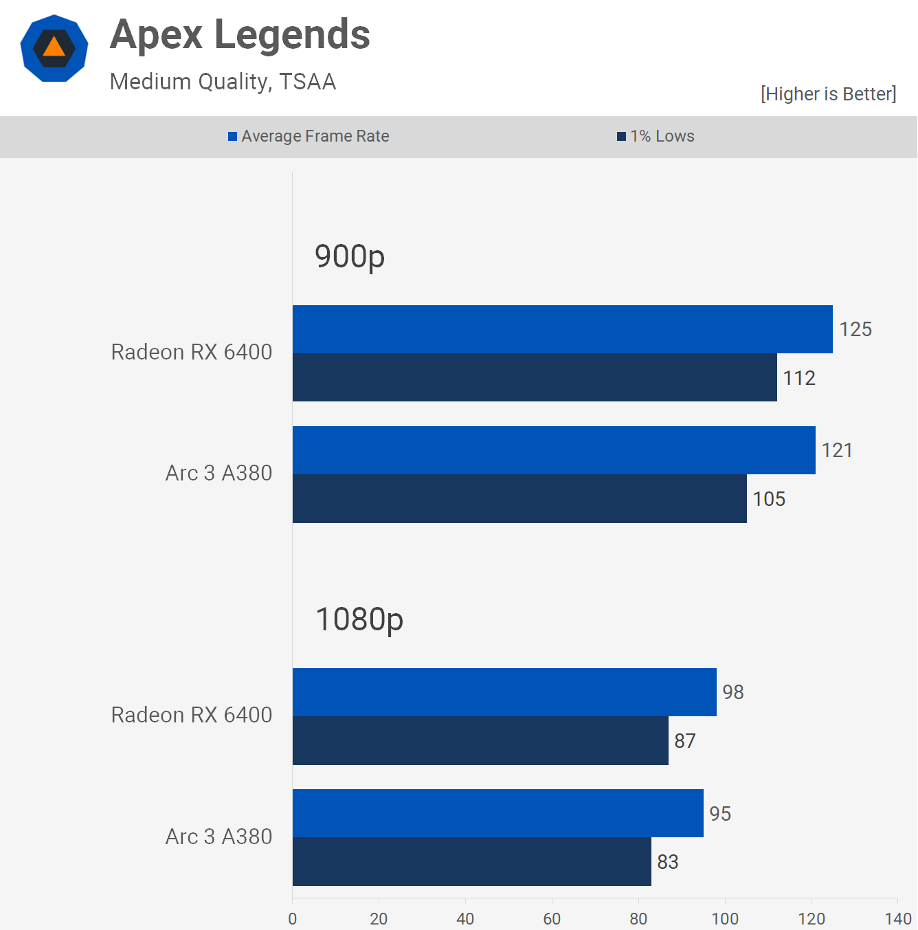 Next we have Apex Legends, and here the A380 was competitive with the Radeon 6400, trailing it by just a few frames and that means both were good for over 90 fps at 1080p. A good result for the A380, especially if it does end up being cheaper than the RX 6400.