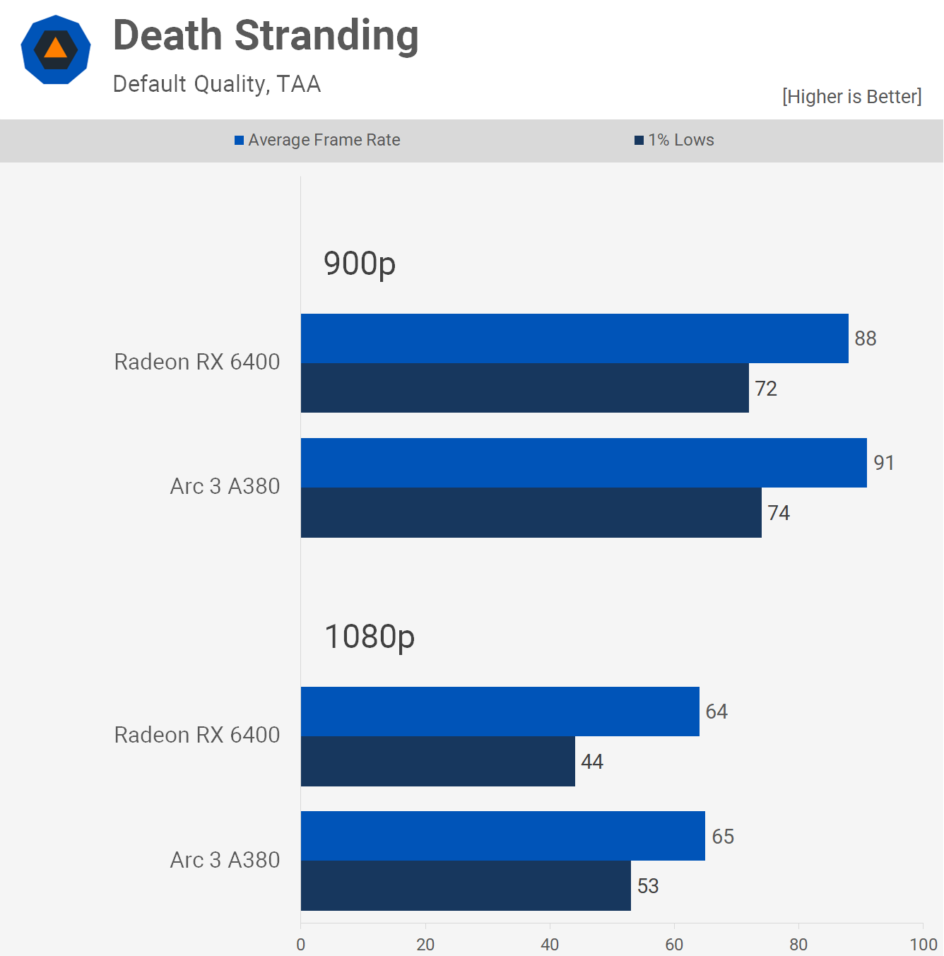 Starting with Death Stranding, we find comparable performance between these two GPUs which is not a bad result for the A380 if it ends up costing ~$50 less than the Radeon 6400.