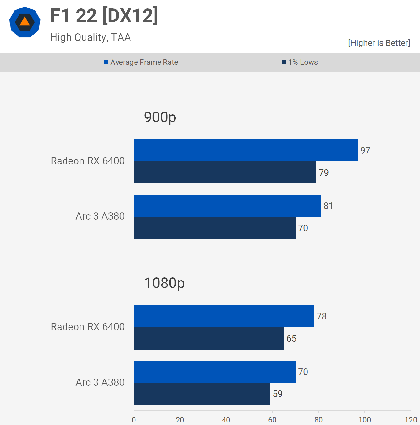 It's a similar story in F1 22, here the A380 was 10% slower at 1080p which isn't too bad, though the 16% margin it trailed by a 900p is starting to get up there and for those with high refresh rate monitors you'll certainly notice the difference here.