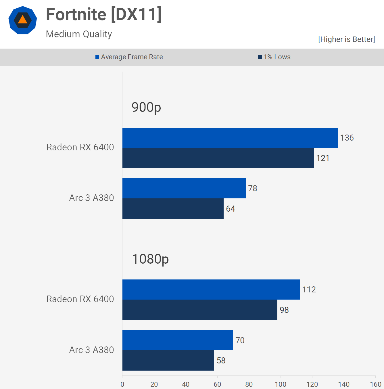 Another title where the Intel A380 struggled was Fortnite. Granted, these frame rates are playable, but they're less than ideal for a competitive shooter and what we received from the Radeon 6400 was significantly more impressive, and far more desirable for those of you rocking a high refresh rate monitor.