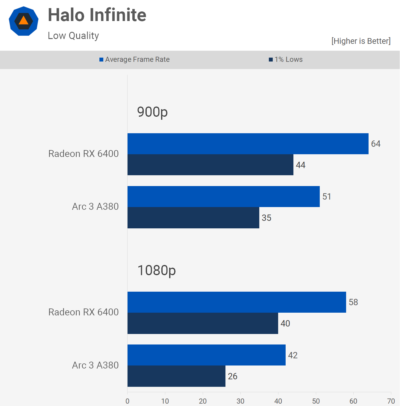 Halo Infinite using the lowest quality settings saw the A380 fail to hit 60 fps, even at 900p, so performance overall was disappointing, especially considering that at 1080p the Radeon 6400 was almost 40% faster.