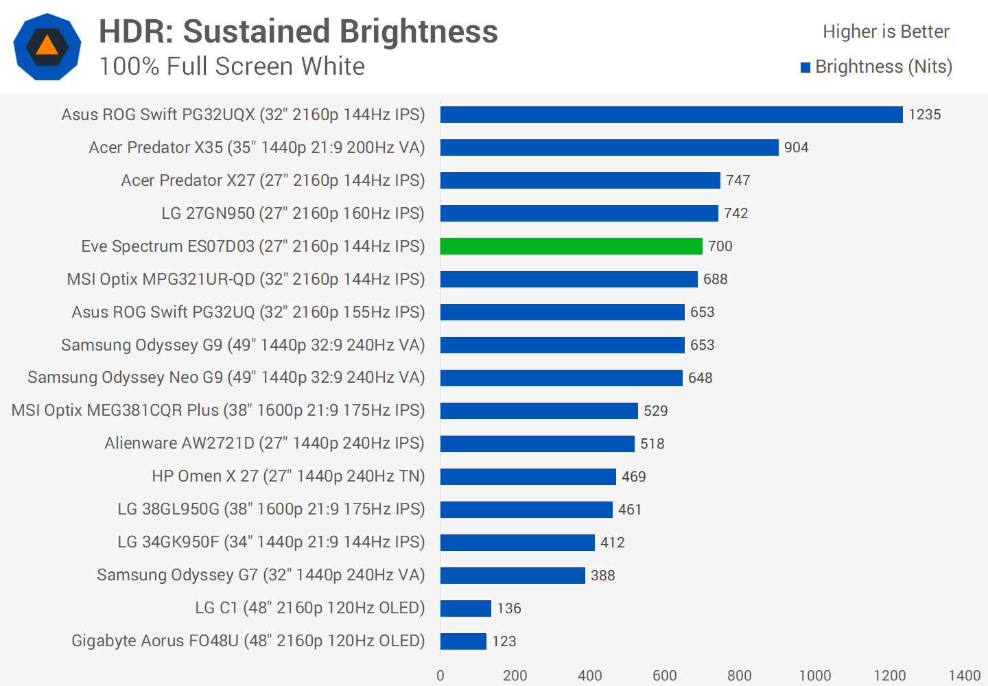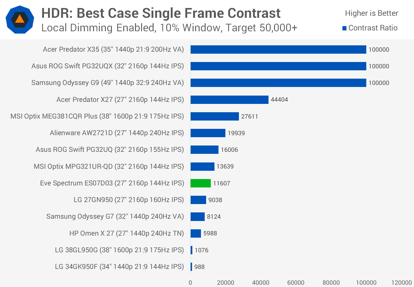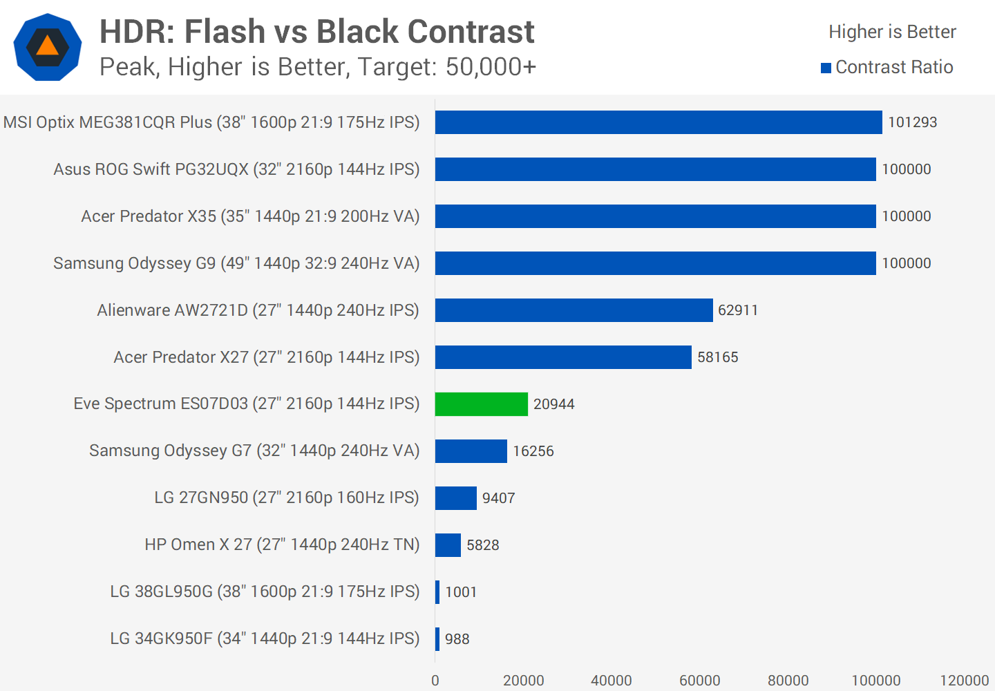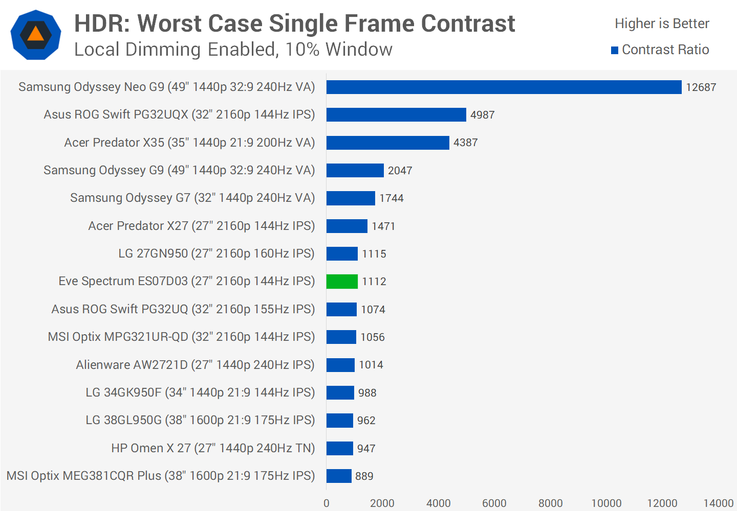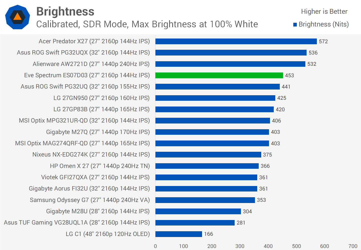 Native contrast ratio is solid, at 1160:1 with my unit. The 4K version of LG's Nano IPS panel doesn't suffer from the same contrast issues as with the 1440p versions, and the Eve Spectrum was even a little better than my 27GN950 sample from LG. Unfortunately though, contrast is poor in general, due to being an IPS panel. VA displays have more than twice the level of contrast, which makes them more suited to dark content or playing games in the dark.