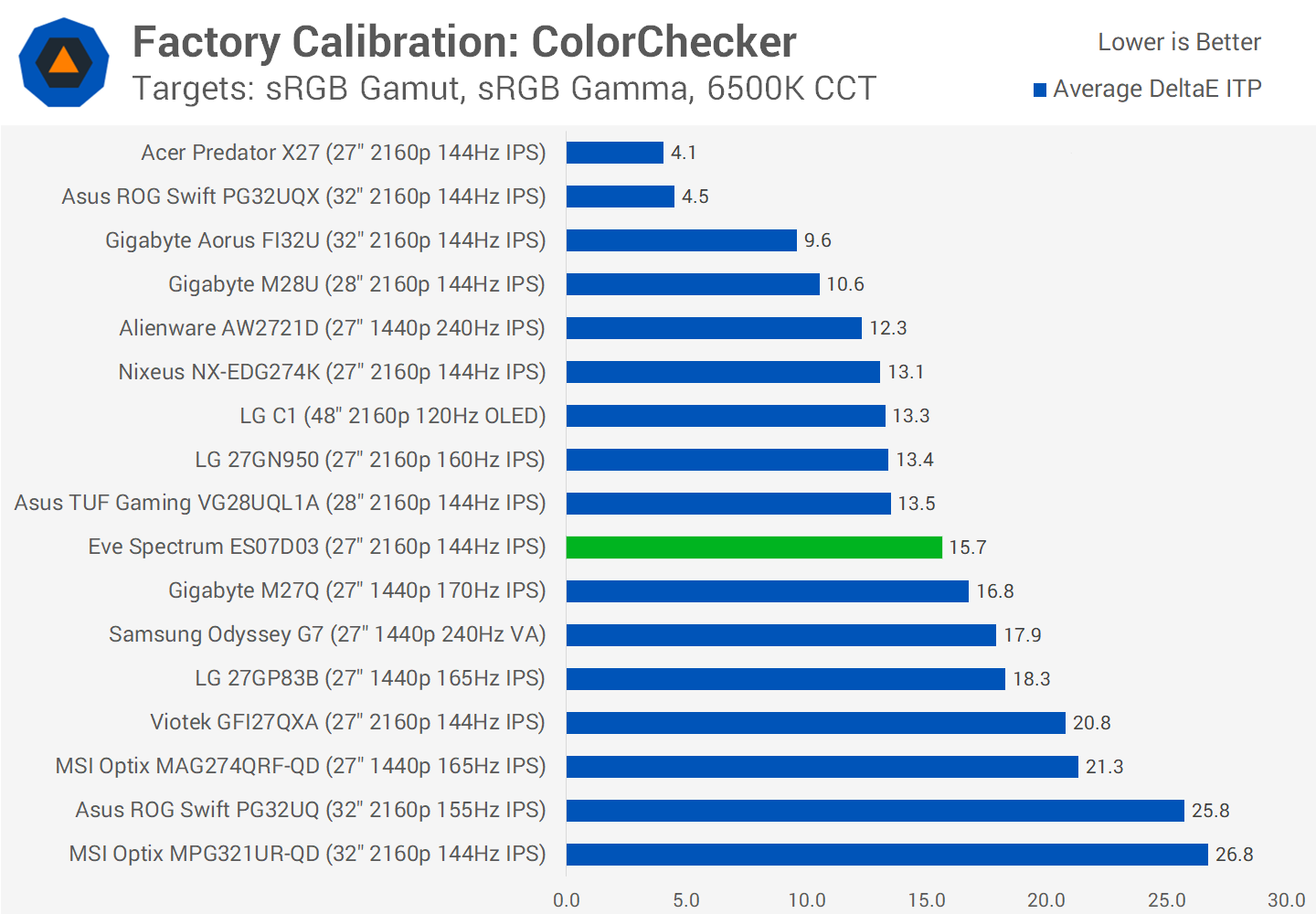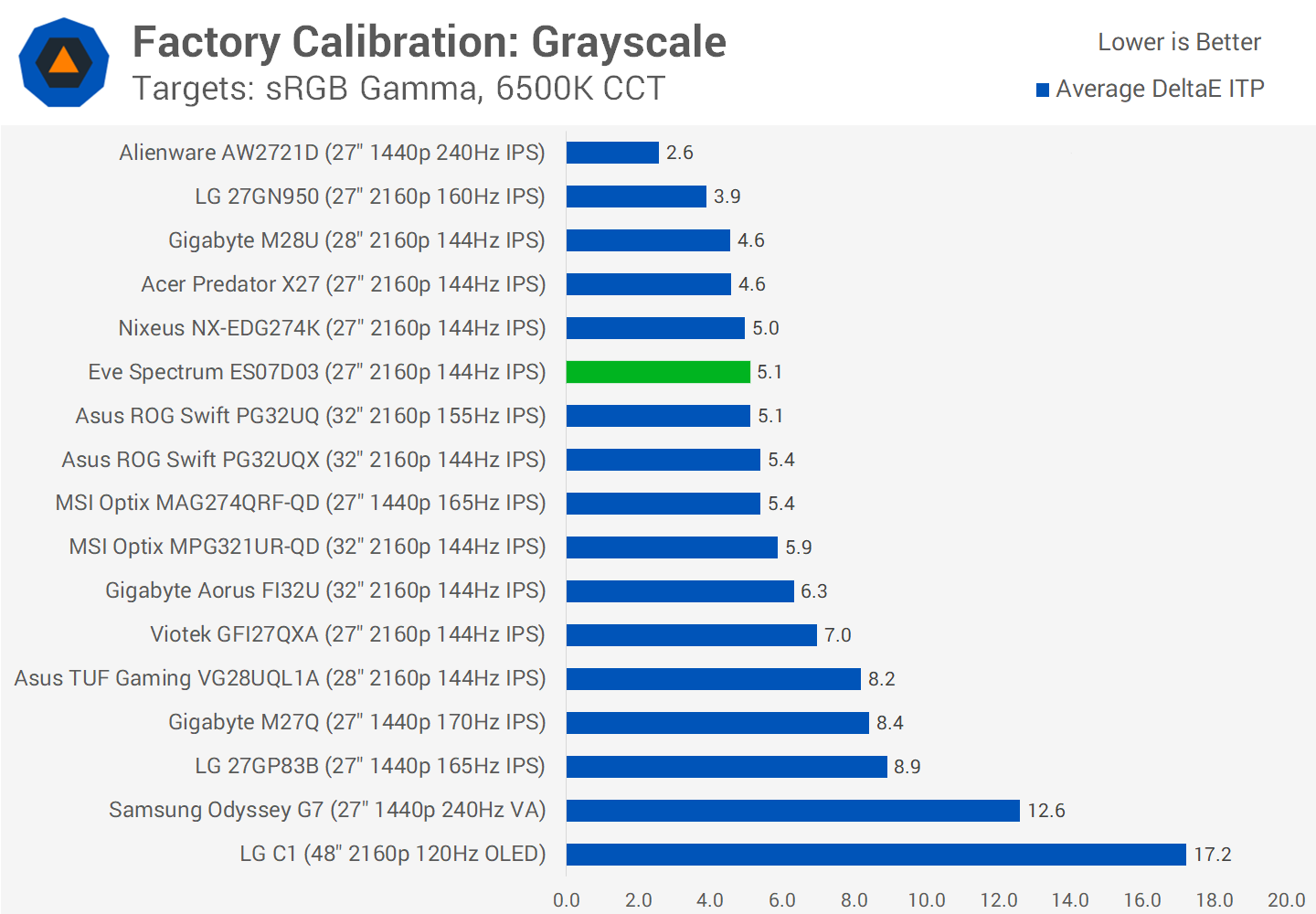 So what we see when compared to other monitors is that the Eve is quite average in ColorChecker performance, but pretty decent for grayscale performance, at least in its default state.