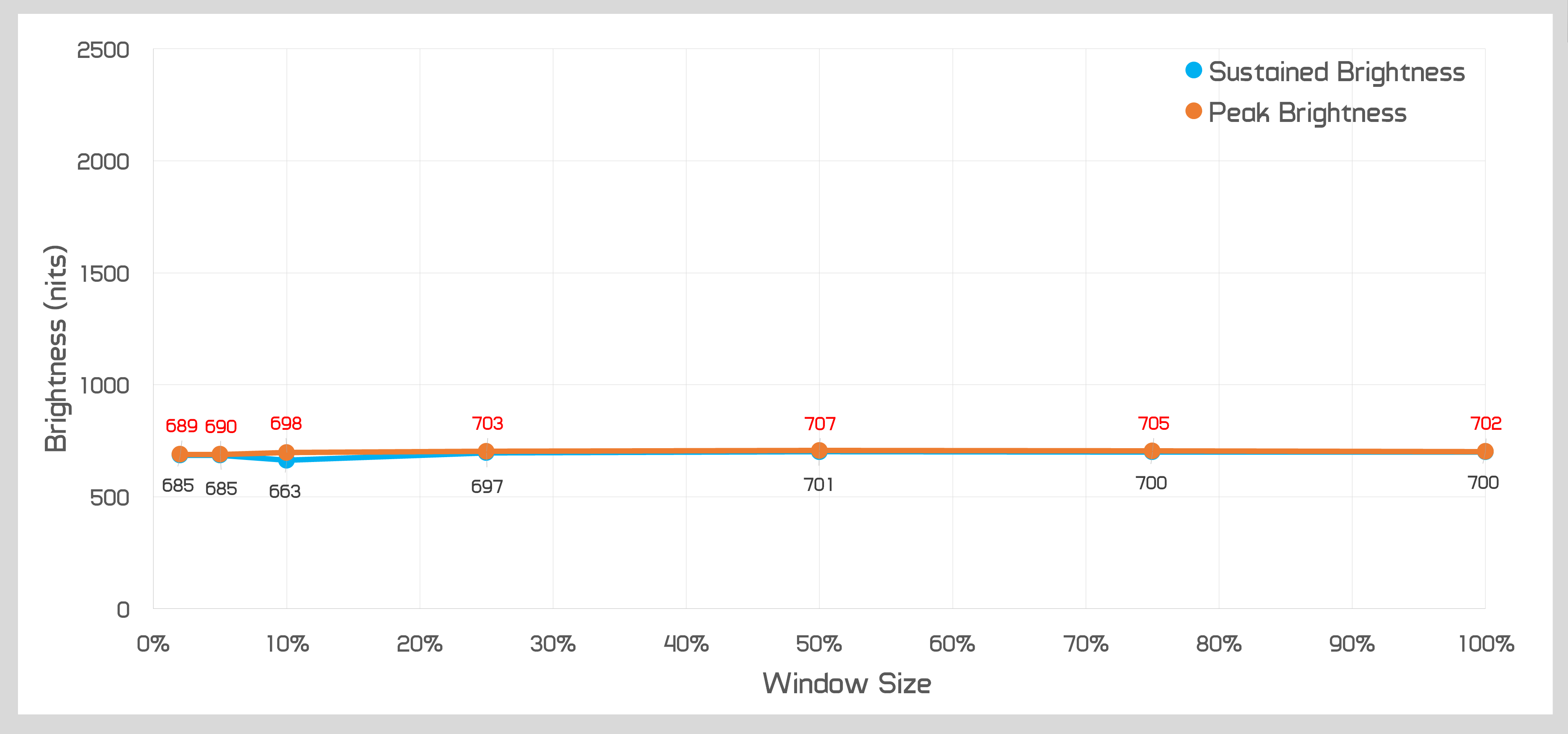 To quickly run through HDR performance, the maximum brightness the panel can achieve is solid, at around the 700 nit mark whether sustained.... as a flash... or at small window sizes. In fact across various window sizes the brightness never dips below 600 nits, whether sustained or peak, which leads to solid brightness, especially at normal monitor viewing distances.