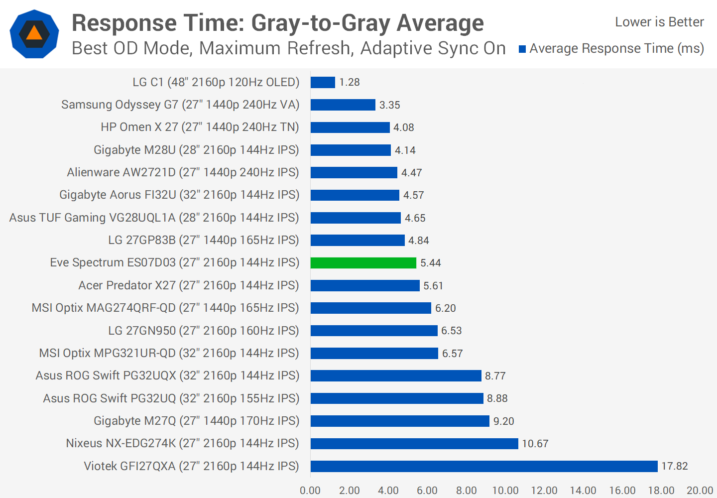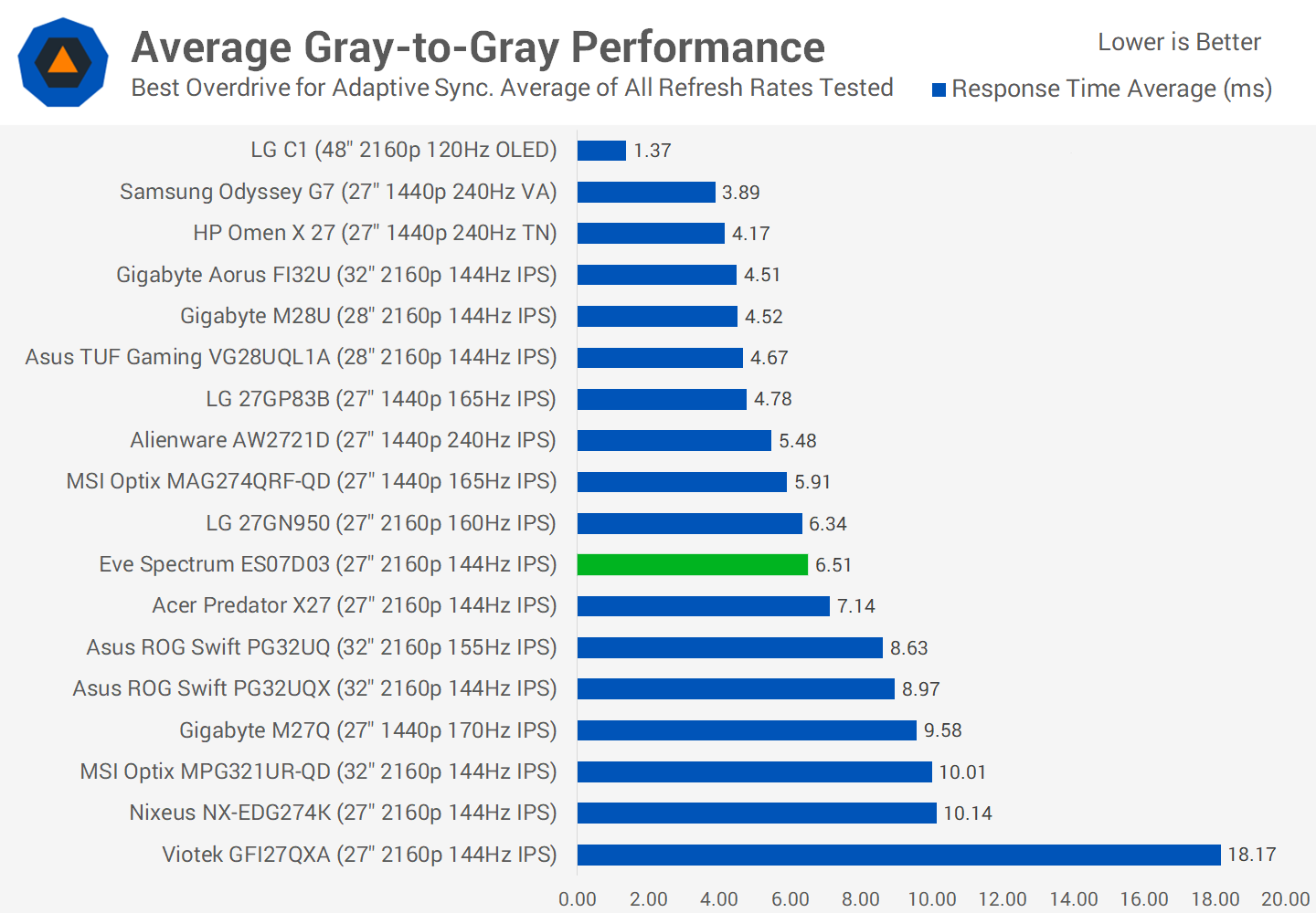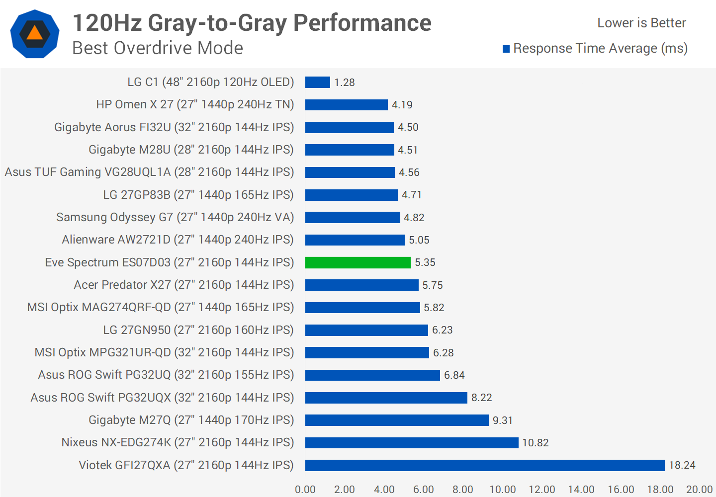 On average across the refresh range, the Spectrum and 27GN950 are virtually identical. While it's nice to get all that user customizable overdrive controls to get the best out of the display, it seems LG is already doing that for you with their offering, so this doesn't give Eve a big advantage on average. Performance again is solid and well balanced, though a monitor like the Gigabyte M28U isn't all that different if we're being honest, providing fast response times at the cost of overshoot.
