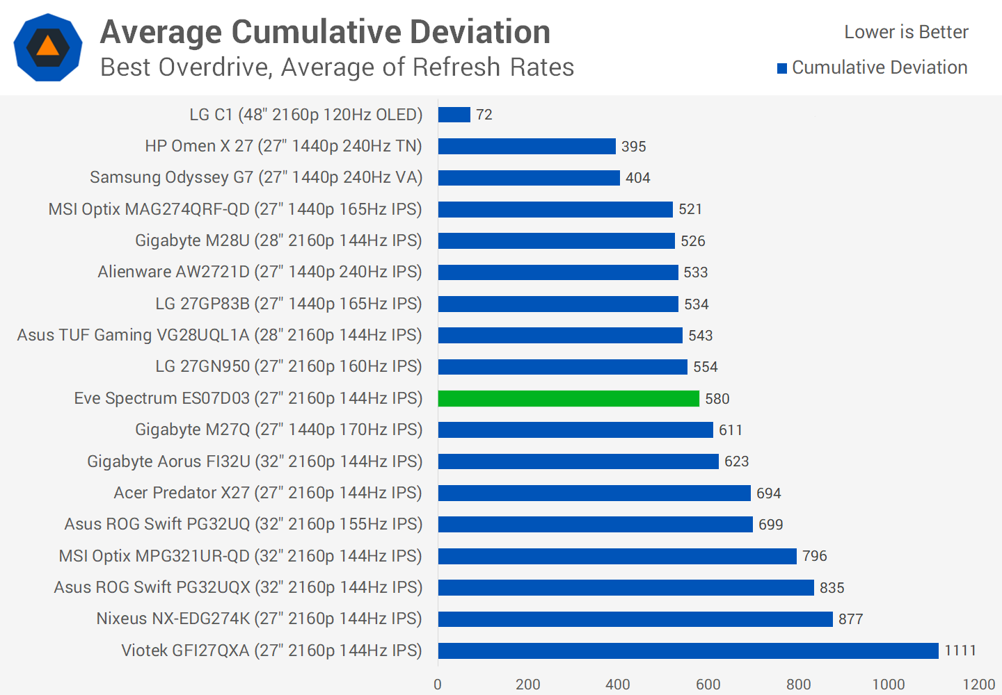 And that's seen further when looking at cumulative deviation, which shows the balance between response times and overshoot. The Gigabyte M28U performs well, among the best for an IPS monitor. The 27GN950 and Eve Spectrum are slightly behind, although really all these monitors deliver a very similar experience on average. The performance is right where I'd want it to be for a modern IPS gaming monitor, which is a result between 500 and 600 in this metric.