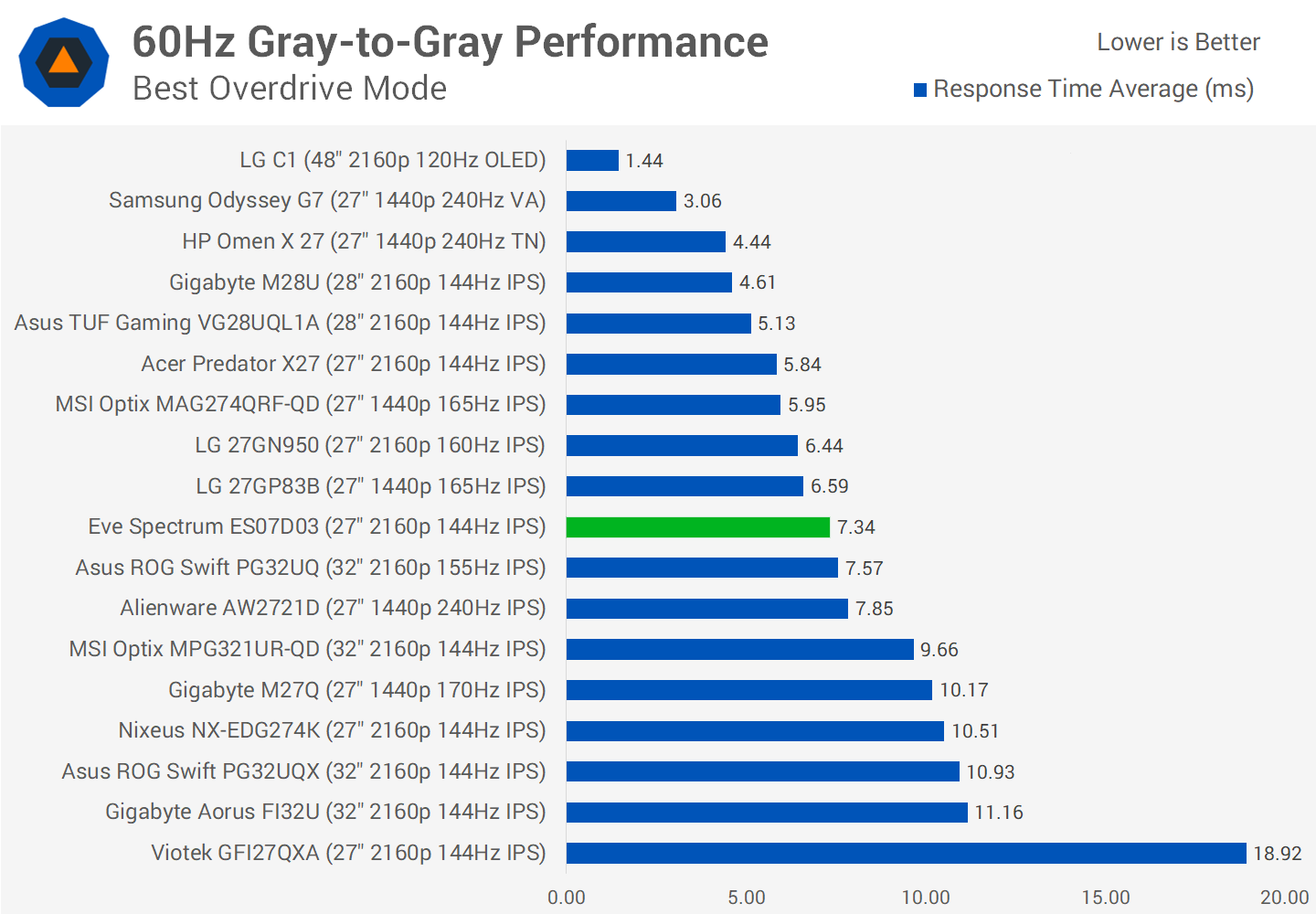 At 120Hz the Spectrum is a mid-table performer, delivering decent results for console gamers looking at that 4K 120Hz experience over HDMI 2.1. Then at 60Hz the Spectrum is once again, pretty typical in terms of its performance with no notable issues. It's slightly slower than the 27GN950 but not to the degree where you should complain, as basically those two monitors deliver the same performance.