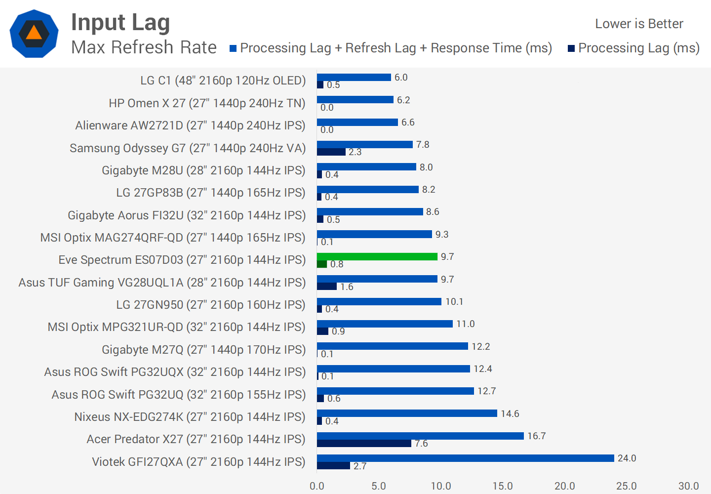 Input lag is a non-issue with the Spectrum, providing less than 1ms of processing delay and mid-tier results all up. The main limiting factor for input latency is the refresh rate, as 144Hz is noticeably slower than 240Hz or higher monitors in terms of lag and smoothness. At this sort of price point you can toss up between 4K 144Hz or 1440p 240Hz, so if you play a lot of competitive titles the faster refresh rate may be of interest to you.