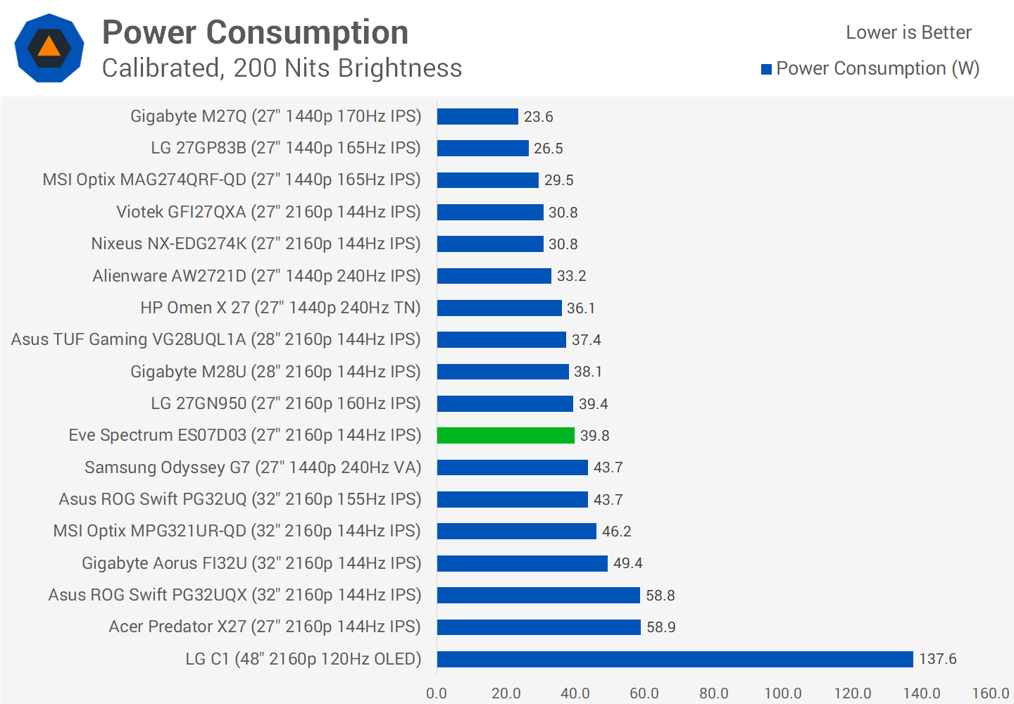 Then we get to power consumption. Unsurprisingly the 27GN950 and ES07D03 are basically identical for power consumption when calibrated to the same brightness output. Both use the same panel, so I wouldn't expect anything different.
